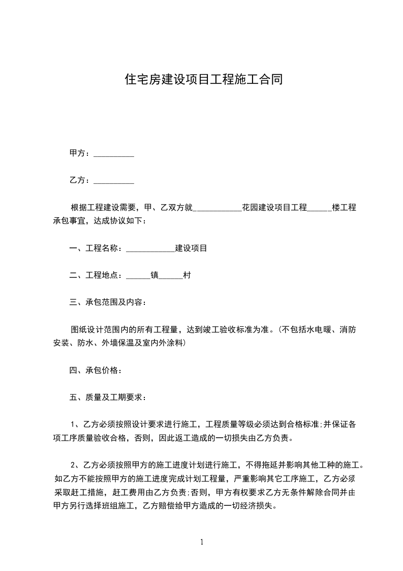 六、工程材料进场: 为保证工程质量,严禁禁止不合格材料进入工地,用法不合格建筑材料,所用法的建筑材料,必需有生产厂家的出厂合格证,甲方对进场材料存在质量怀疑,乙方必需和甲方共同在现场取样送检测部门检测,检测合格后才能用 本工程。 住宅工程施工合同篇二 甲方(房仆人):乙方(承包人): 甲乙双方在公平自愿的原则上,依据有关(法律)法规,公正合理,互惠互利的原则下,通过双方协商就私人住宅建房工程达成协议,为规范建筑私人住宅工程中双方的民事行为,特制定本合同规定,盼望双方严格执行,共同遵守。