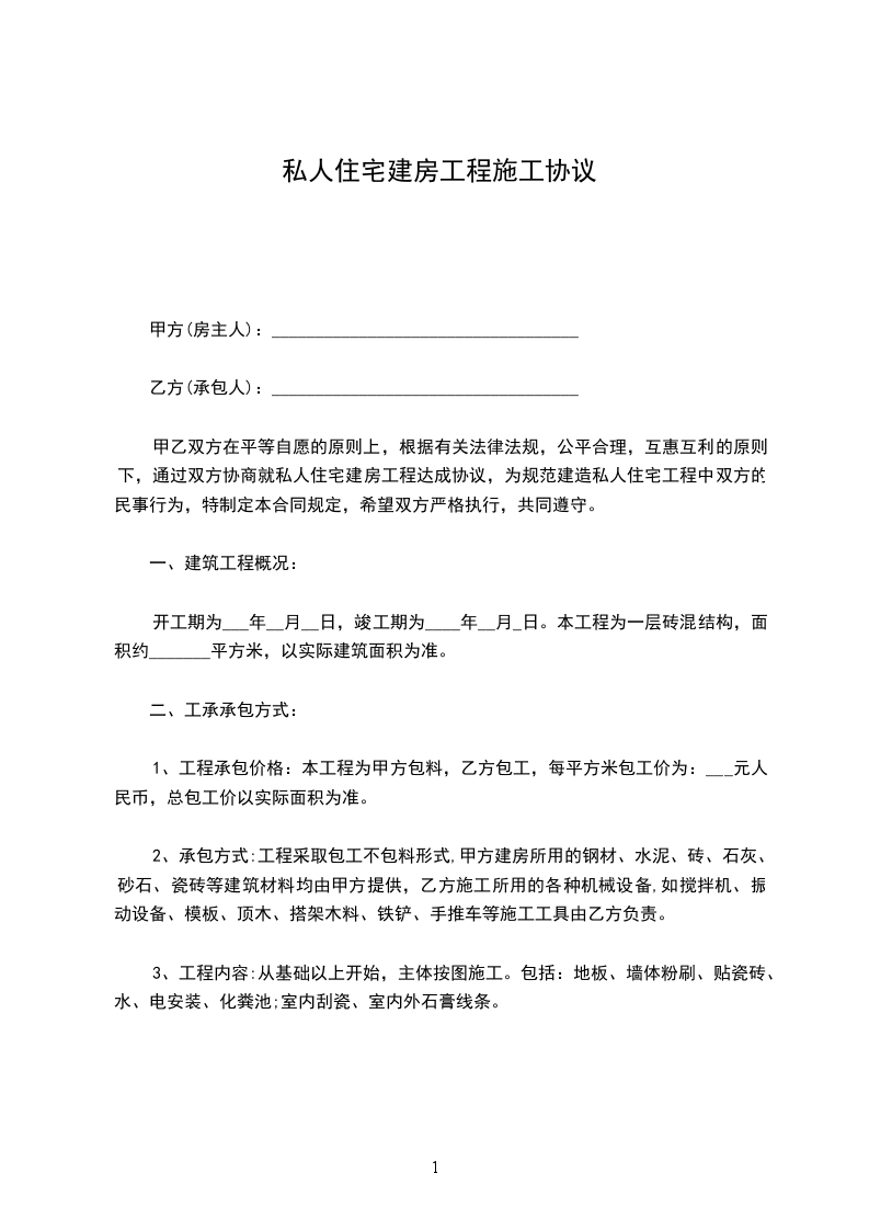 一、承包方式 采纳包工不包料方式承包。 甲方供应建房所需的材料,包括:红砖、河砂、碎石、石灰、水泥、钢材、水管、下水管、铁钉、扎丝、水电等等一切建筑材料。 乙方供应劳务、施工技术、施工工具、及生产生活的一切用具等。
