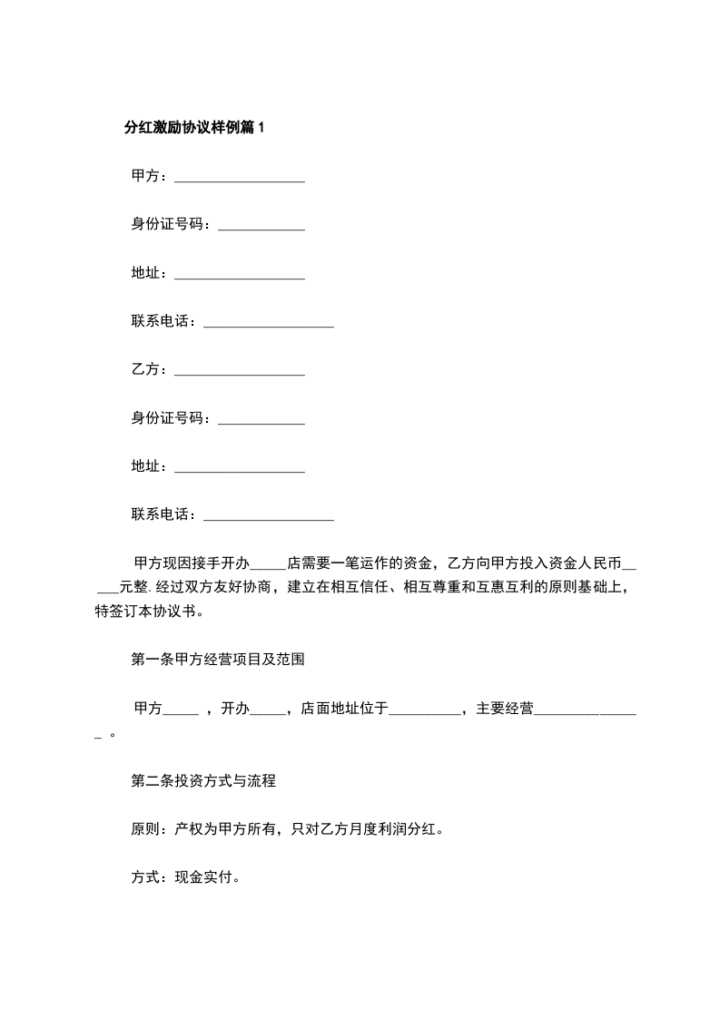 1、在公司经营活动中所得利润扣除各项开支,仍得以盈利的前提下,甲方从盈余中抽取___%的资金将对乙方予以分红。红利支付时间为每年的___月___日,以现金方式支付。