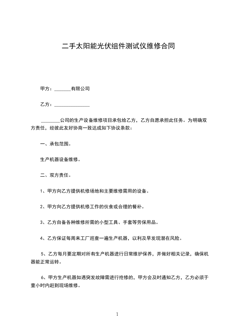 ________公司的生产设备维修项目承包给乙方,乙方自愿承担此任务。为明确双方责任,经彼此友好协商一致达成如下协议条款: