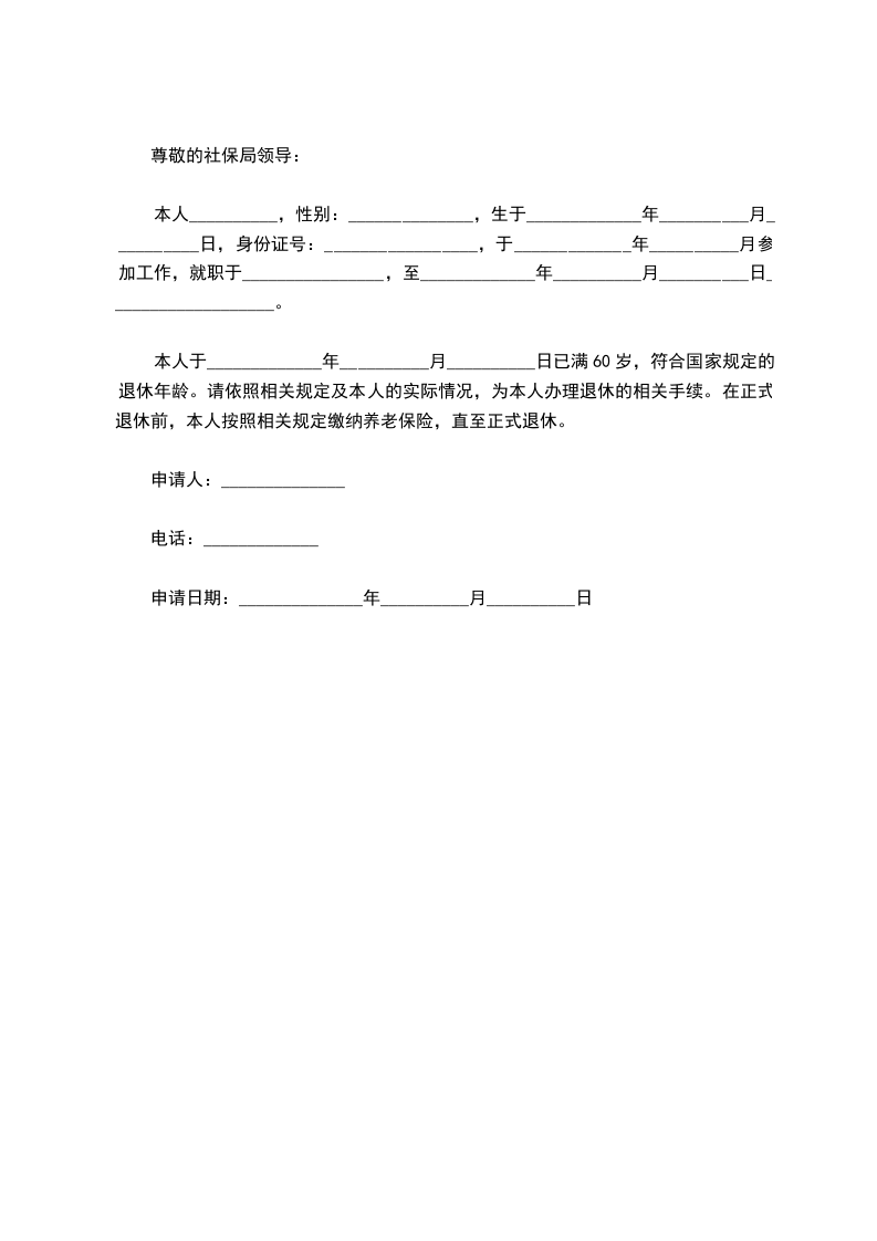 本人于_____________年__________月__________日已满60岁,符合国家规定的退休年龄。请依照相关规定及本人的实际情况,为本人办理退休的相关手续。在正式退休前,本人按照相关规定缴纳养老保险,直至正式退休。