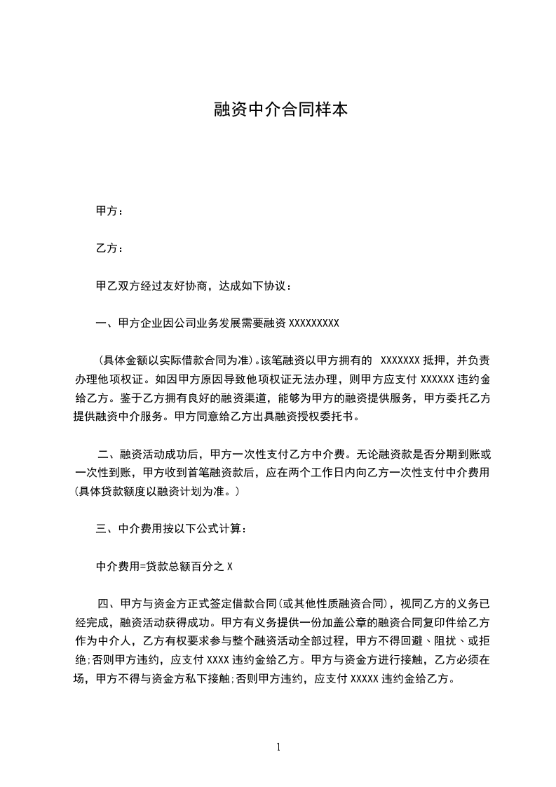 (具体金额以实际借款合同为准)。该笔融资以甲方拥有的XXXXXXX抵押,并负责办理他项权证。如因甲方原因导致他项权证无法办理,则甲方应支付XXXXXX违约金给乙方。鉴于乙方拥有良好的融资渠道,能够为甲方的融资提供服务,甲方委托乙方提供融资中介服务。甲方同意给乙方出具融资授权委托书。