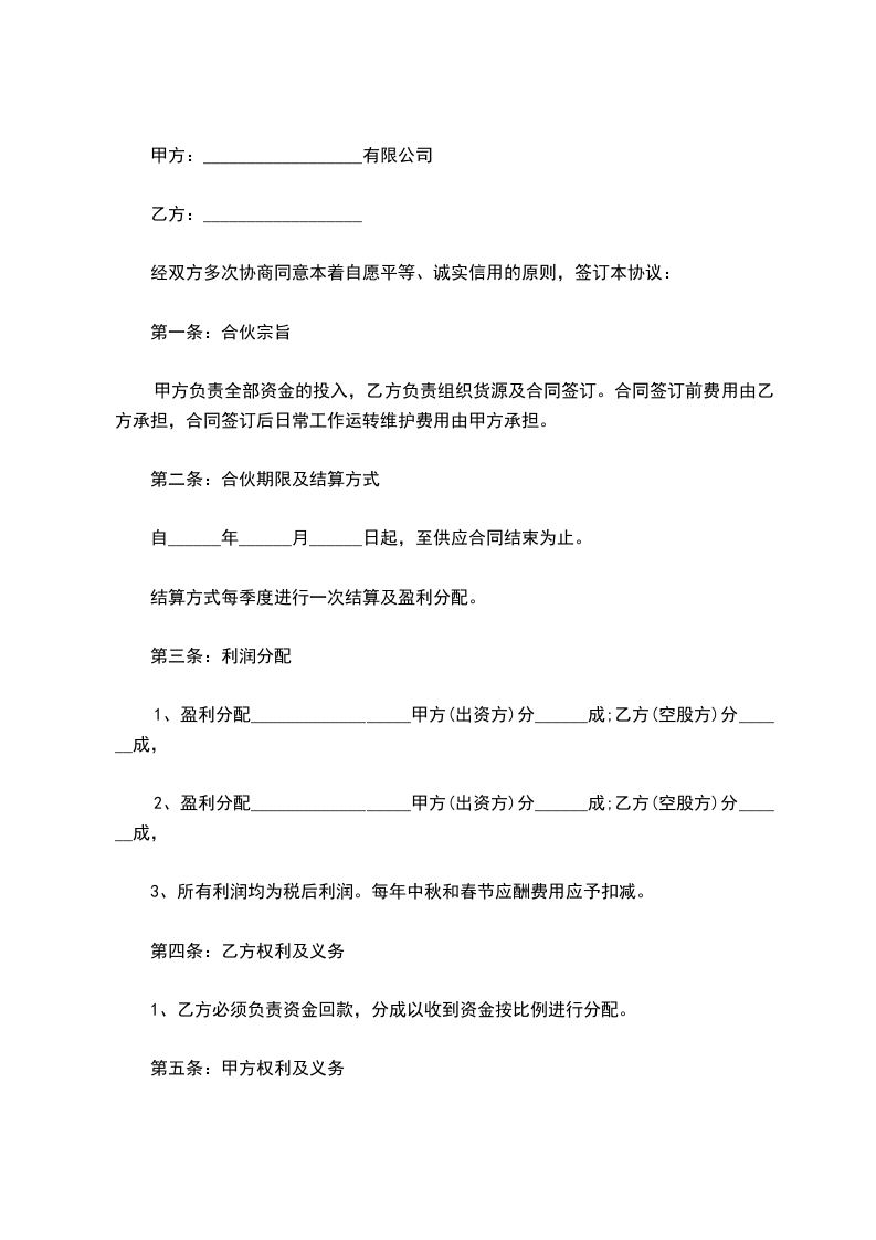 2、盈利分配__________________甲方(出资方)分______成;乙方(空股方)分______成,