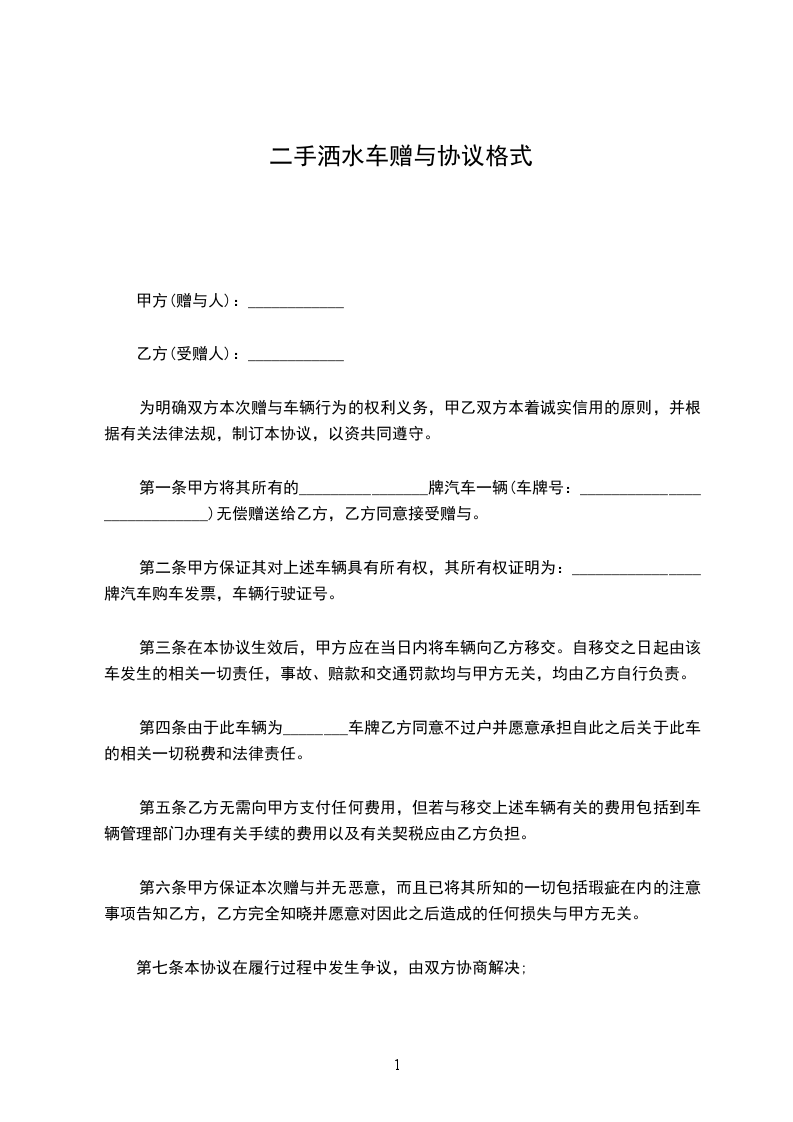 第一条甲方将其所有的________________牌汽车一辆(车牌号:____________________________)无偿赠送给乙方,乙方同意接受赠与。