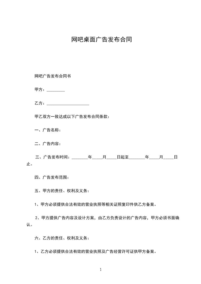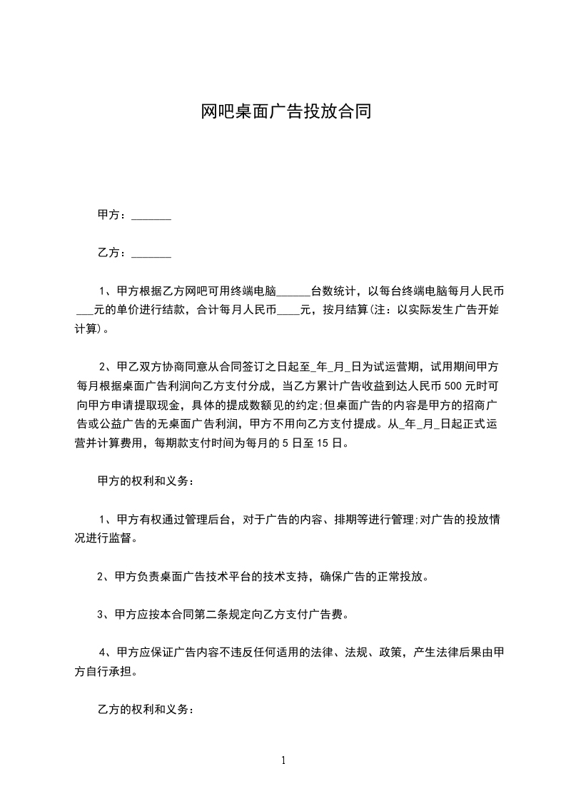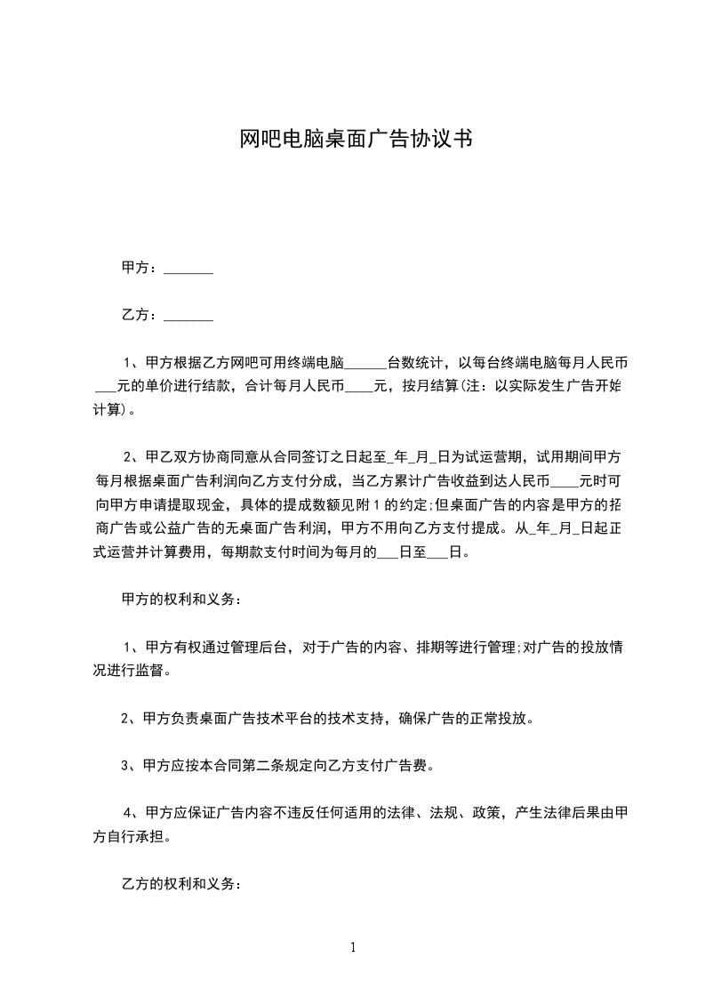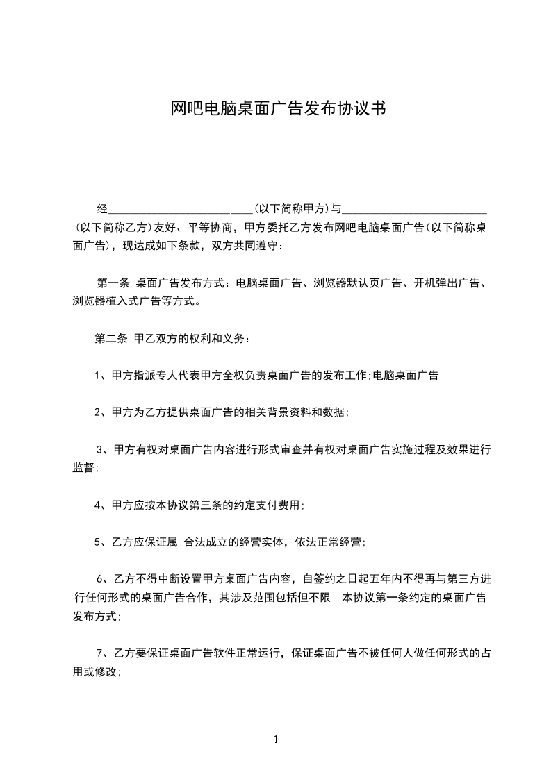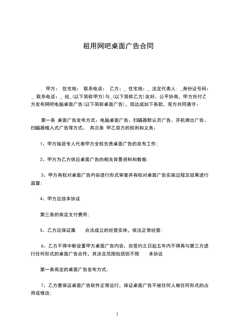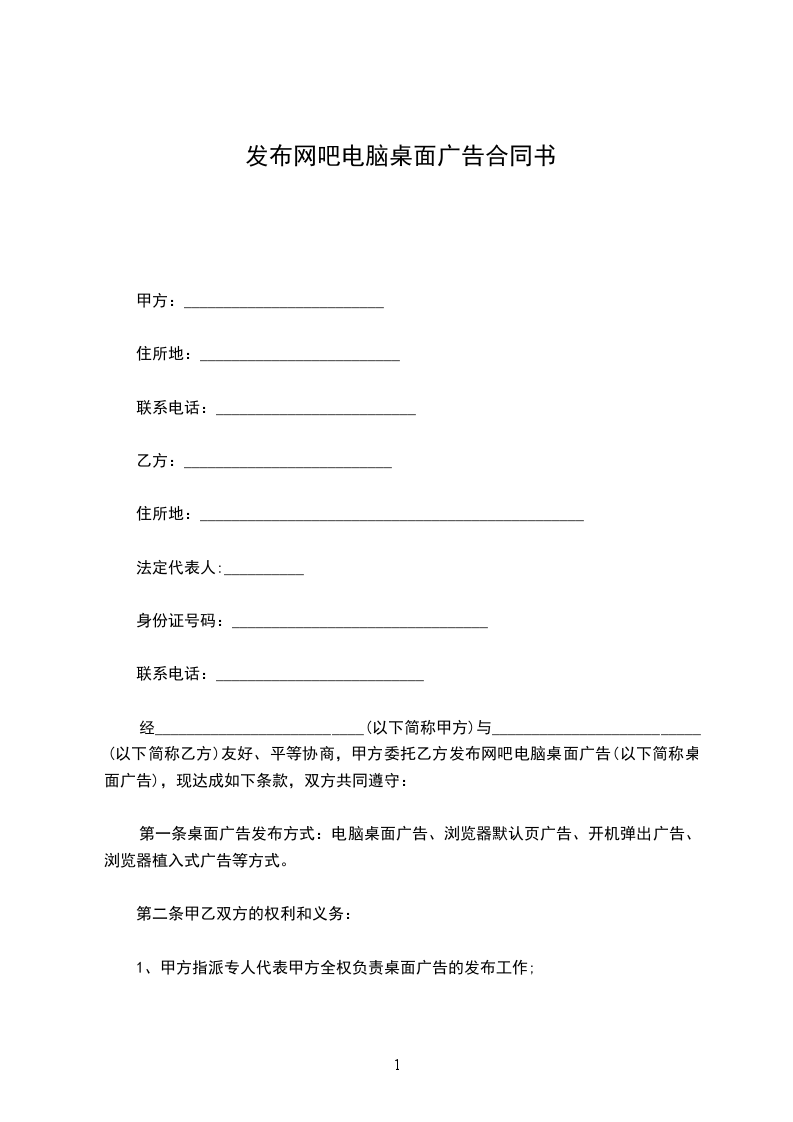 . 甲方: 住宅地: 联系电话: 乙方:_ 住宅地:_ 法定代表人: _身份证号码:_ 联系电话:_ 经_(以下简称甲方)与_(以下简称乙方)友好、公平协商,甲方托付乙方发布网吧电脑桌面广告(以下简称桌面广告),现达成如下条款,双方共同遵守: