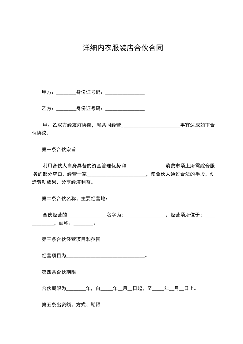 4、本合伙出资共计人民币_________元整。合伙期间各合伙人的出资为共有财产,不得随意请求分割,合伙终止后,所有财产为各合伙人平分。
