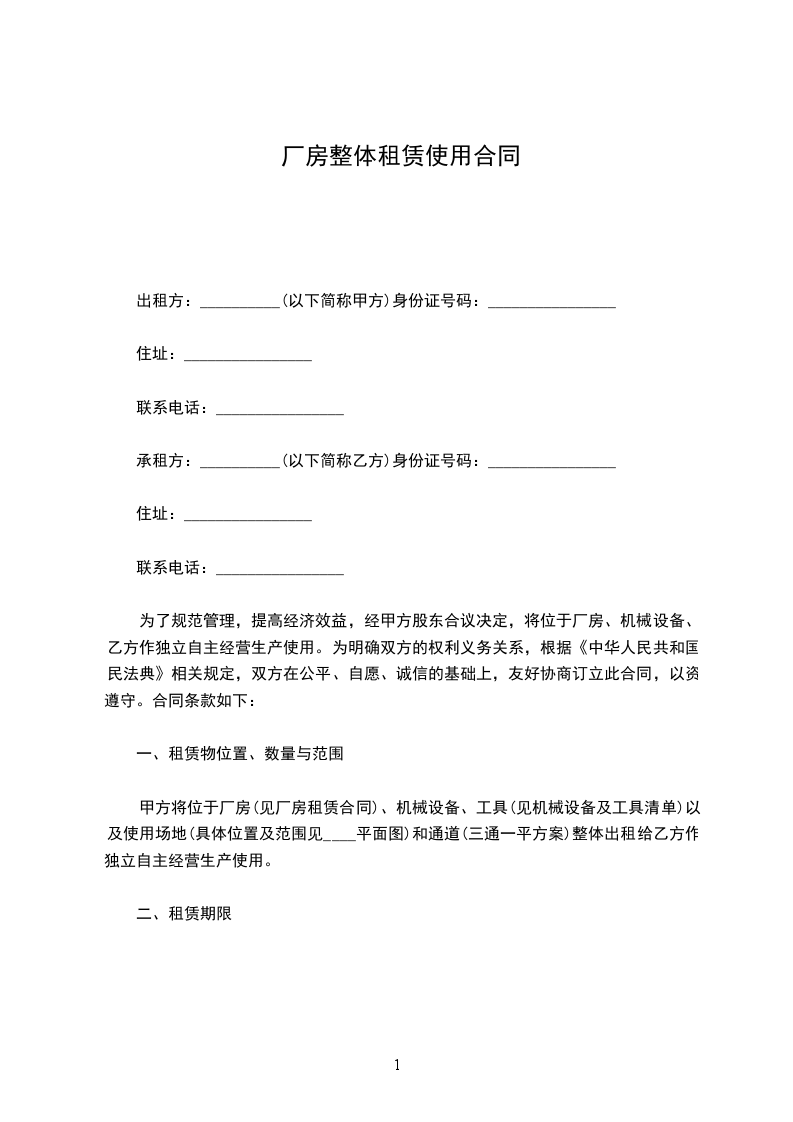 二、乙方租用该厂房期限为年,即自_____年_____月_____日至_____年_____月_____日止。