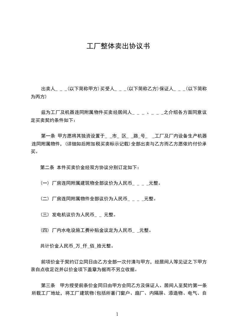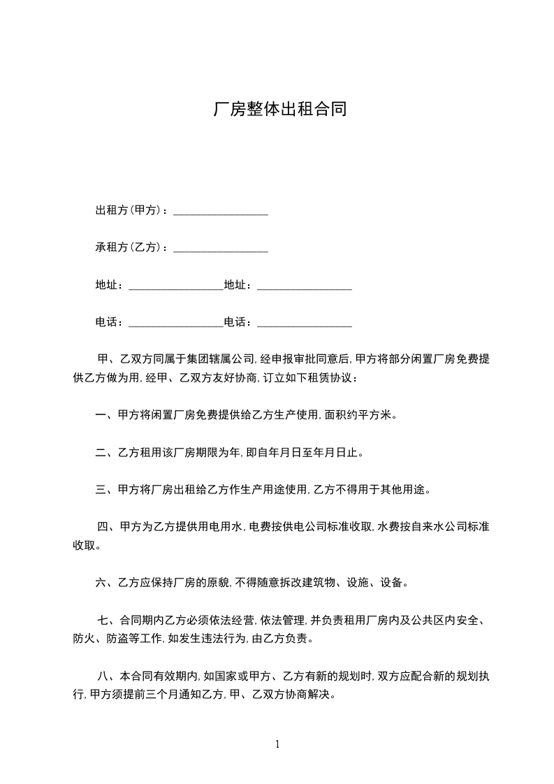 一、甲方将闲置厂房免费提供给乙方生产使用,面积约平方米。
