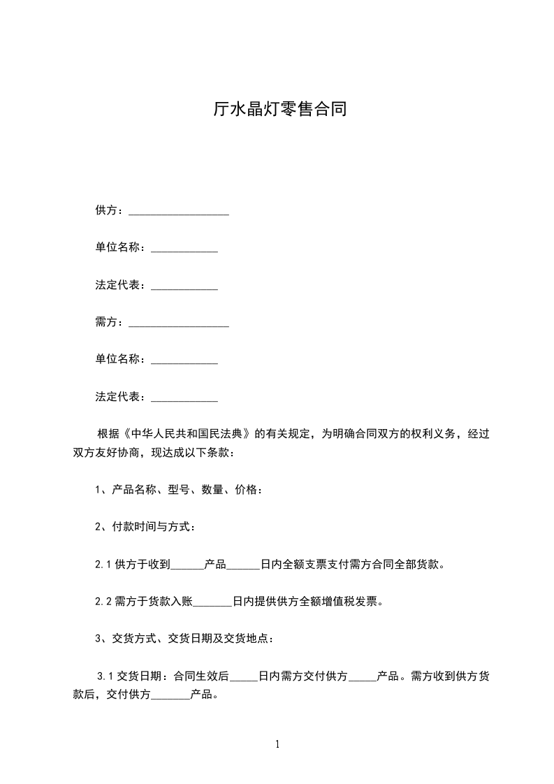 1、交货日期:以甲方支付定金之日起_______天内交货,安装工期为交货之日起_______个工作日。如由于未及时支付定金,造成交货延迟由甲方负责。