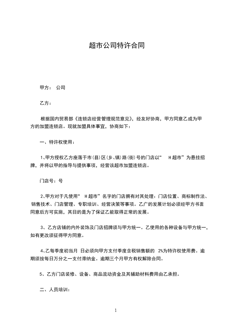 1.甲方授权乙方座落于_________市(县)_________区(乡、镇)_________路(街)_________号的门店以“_________超市”为悬挂招牌,并将以甲的指导与提供事项,经营该超市加盟连锁店;门店号:_________号。
