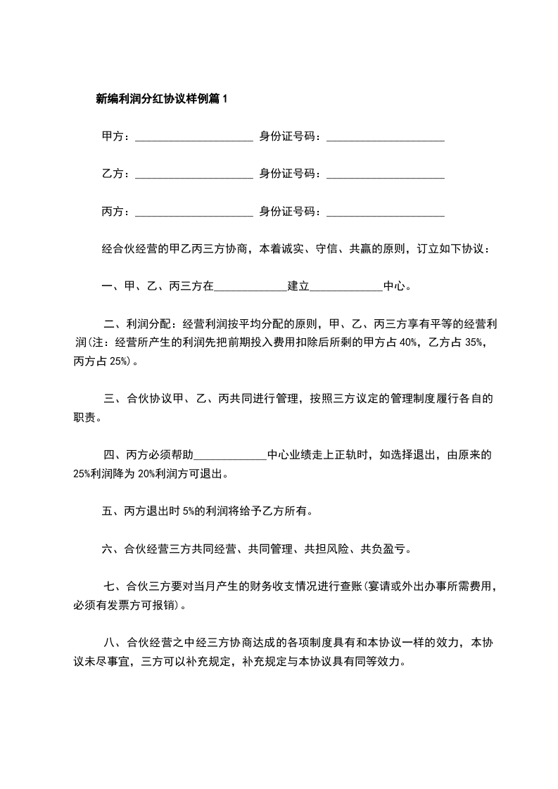 1、如甲方违反本协议约定,迟延支付或者拒绝支付乙方可得分红的,应按可得分红总额的 %向乙方支付违约金。