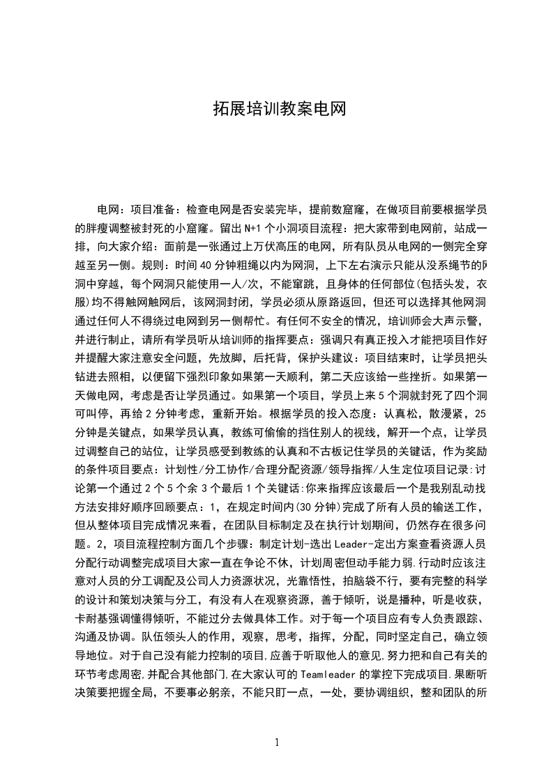 电网:项目准备:检查电网是否安装完毕,提前数窟窿,在做项目前要根据学员的胖瘦调整被封死的小窟窿。留出N+1个小洞项目流程:把大家带到电网前,站成一排,向大家介绍:面前是一张通过上万伏高压的电网,所有队员从电网的一侧完全穿越至另一侧。规则:时间40分钟粗绳以内为网洞,上下左右演示只能从没系绳节的网洞中穿越,每个网洞只能使用一人/次,不能窜跳,且身体的任何部位(包括头发,衣服)均不得触网触网后,该网洞封闭,学员必须从原路返回,但还可以选择其他网洞通过任何人不得绕过电网到另一侧帮忙。有任何不安全的情况,培训师会大声示警,并进行制止,请所有学员听从培训师的指挥要点:强调只有真正投入才能把项目作好,并提醒大家注意安全问题,先放脚,后托背,保护头建议:项目结束时,让学员把头钻进去照相,以便留下强烈印象如果第一天顺利,第二天应该给一些挫折。如果第一天做电网,考虑是否让学员通过。如果第一个项目,学员上来5个洞就封死了四个洞,可叫停,再给2分钟考虑,重新开始。根据学员的投入态度:认真松,散漫紧,25分钟是关键点,如果学员认真,教练可偷偷的挡住别人的视线,解开一个点,让学员过调整自己的站位,让学员感受到教练的认真和不古板记住学员的关键话,作为奖励的条件项目要点:计划性/分工协作/合理分配资源/领导指挥/人生定位项目记录:讨论第一个通过2个5个余3个最后1个关键话:你来指挥应该最后一个是我别乱动找方法安排好顺序回顾要点:1,在规定时间内(30分钟)完成了所有人员的输送工作,但从整体项目完成情况来看,在团队目标制定及在执行计划期间,仍然存在很多问题。2,项目流程控制方面几个步骤:制定计划-选出Leader-定出方案查看资源人员分配行动调整完成项目大家一直在争论不休,计划周密但动手能力弱.行动时应该注意对人员的分工调配及公司人力资源状况,光靠悟性,拍脑袋不行,要有完整的科学的设计和策划决策与分工,有没有人在观察资源,善于倾听,说是播种,听是收获,卡耐基强调懂得倾听,不能过分去做具体工作。对于每一个项目应有专人负责跟踪、沟通及协调。队伍领头人的作用,观察,思考,指挥,分配,同时坚定自己,确立领导地位。对于自己没有能力控制的项目,应善于听取他人的意见,努力把和自己有关的环节考虑周密,并配合其他部门,在大家认可的Teamleader的掌控下完成项目.果断听决策要把握全局,不要事必躬亲,不能只盯一点,一处,要协调组织,整和团队的所有成员,发挥出集体的力量,变内耗为互补互助,使团队获得长期发展的原动力。应该学会沉默,但不是放弃.对于自己认为很好的意见,寻找合适的时机或相关人员提出.对于任何一个项目,都应该考虑周密,对于随时可能发生的变化应有补救措施或其他可选方案.在工作中不能忽视各种隐患,哪怕是很微不足道的细节(麦当劳烫伤事件)对机会的把握:机会往往只降临一次,容易丢失,不容错过,要珍惜每一次机会在选择项目组成员时,不仅要考虑到成员的技能,还应考虑成员的性格类型是否能够相互配合来完成.资源管理:每个网洞,每个队员都是我们的资源,要学会合理利用资源,要对所掌握的资源有一个清醒的认识,分工要合理,明确,不能浪费资源。朋友是资源,关系是生产力网洞不同,所以我们要正视环境,因为任何一个人都无法独立进行不到最后的时刻,不要高兴得太早而放松警惕。嘻嘻哈哈,不坚持到底.赢者通吃!有些人在做其他项目时,比较成功,被胜利冲混了头脑,而在这个项目上特别失败,当作游戏,要当头棒喝,点出他们的错误。一般人每个网洞都是可以通过的,在现实生活中,困难往往没有我们想象的那么大。过低的估计自己的能力,过高的估计困难2,如果学员相互埋怨,存在多过一个算一个的态度,要提醒他们怎么看待团队绩效,个人的不负责任,对团队的影响。3,思想是正确的,成功的概念每个人各不相同,需要找出不同需求,沿着正确的思想行动习惯性格命运。如果你在篮筐下,以错误的方法投篮,一定会的到一个错误的结果。4,拓展训练的效果,并不是以项目的成功和失败来衡量,而是看大家是否投入,认真的去思考,是否从项目中得到感悟,刺激,把这些感悟带回日常工作生活中。(温水煮青蛙的故事?