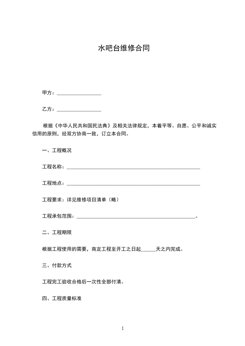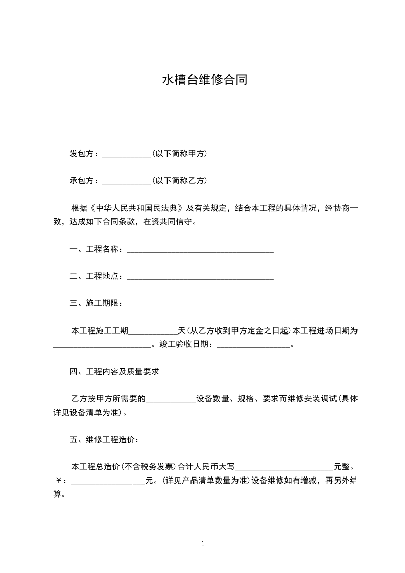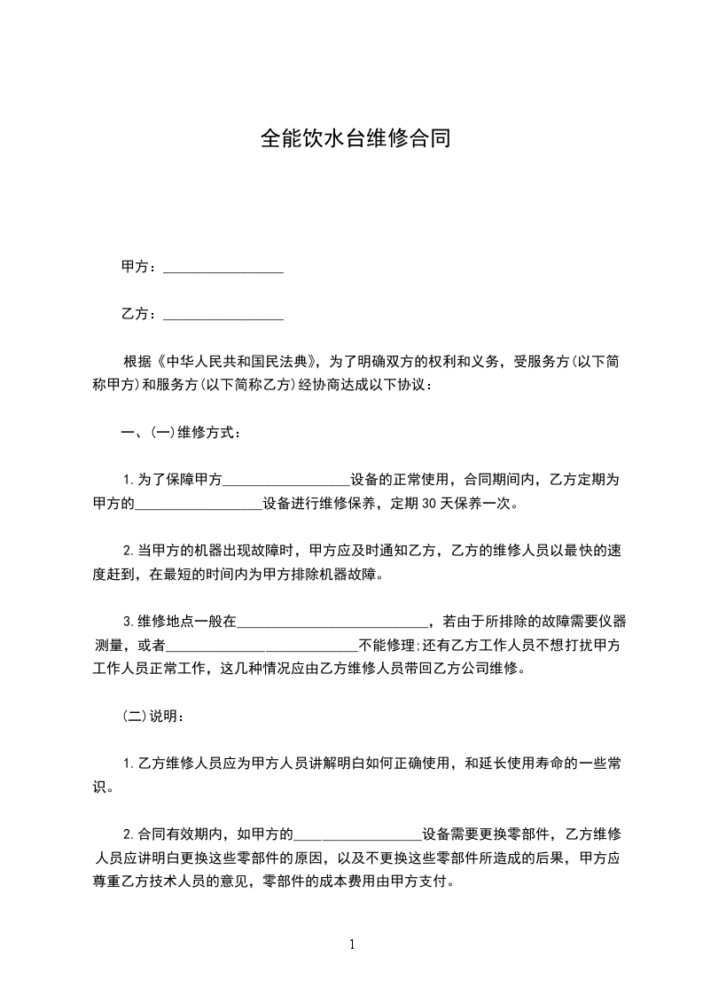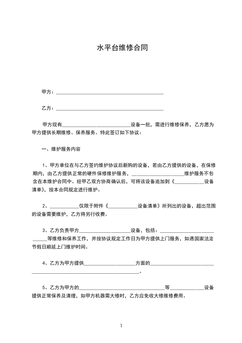 1、为了保障甲方______________设备的正常使用,合同期间内,乙方定期为甲方的_____________________设备进行维修保养,定期______________天保养一次。
