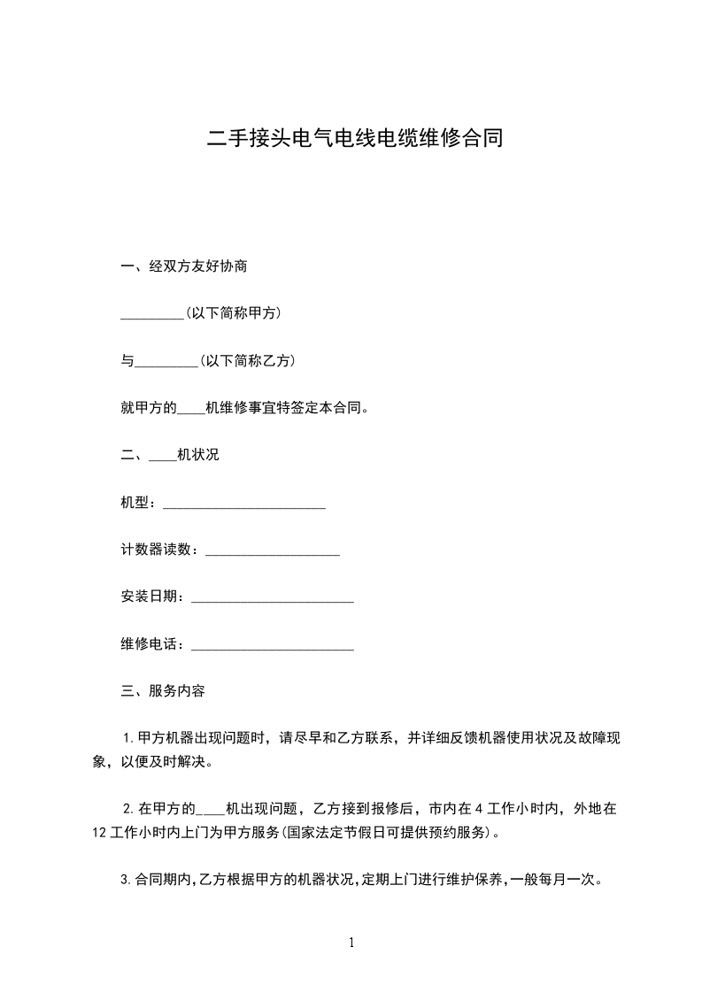 四、根据____机的状况,经双方协商,同意乙方收取甲方____机年维修费为人民币(大写)______元,(小写)¥______元。