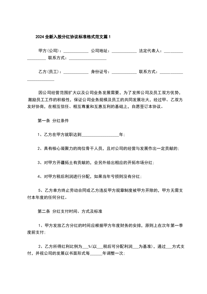 2024全新入股分红协议标准格式范文篇2