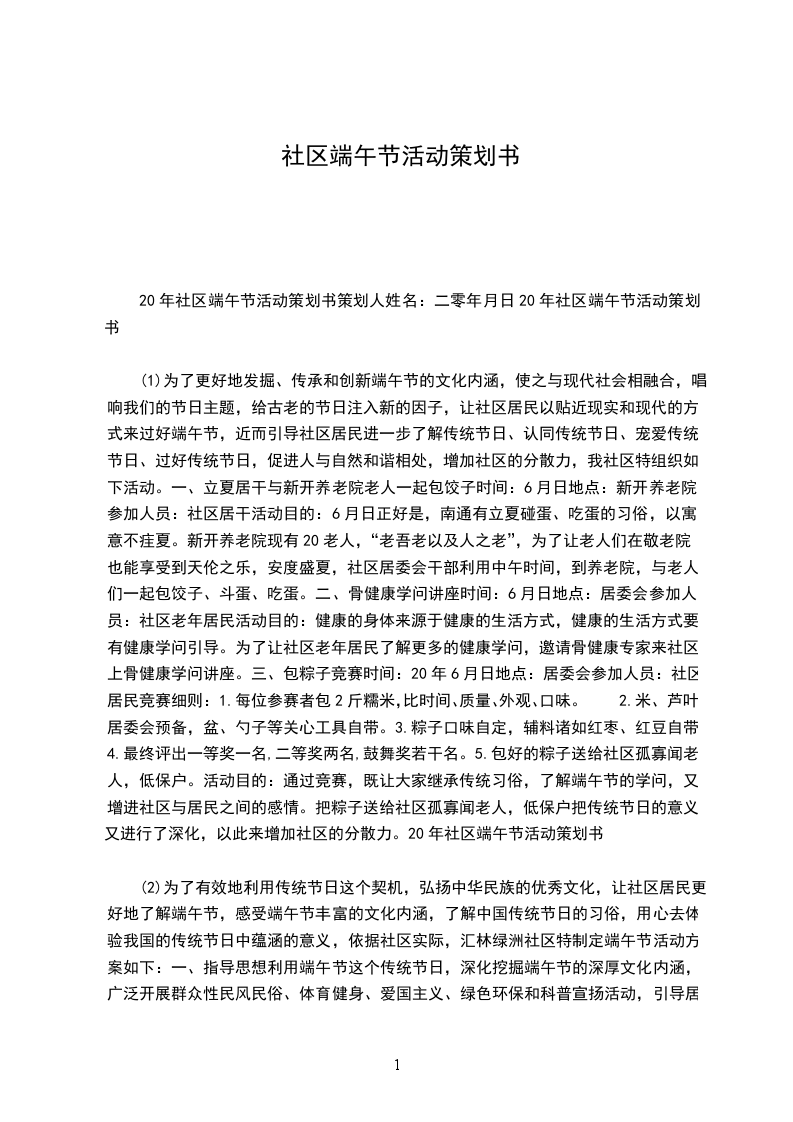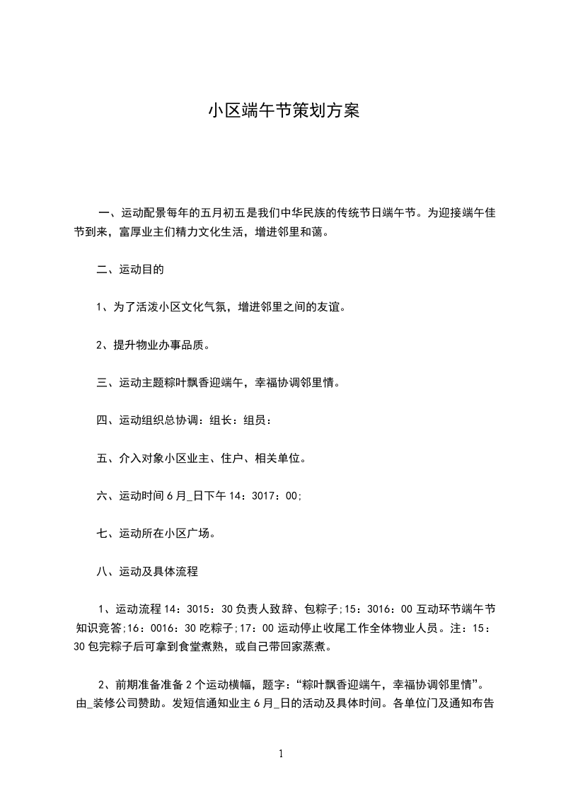 2、前期准备准备2个运动横幅,题字:“粽叶飘香迎端午,幸福协调邻里情”。由_装修公司赞助。发短信通知业主6月_日的活动及具体时间。各单位门及通知布告栏张贴通知。发OA及短信通知各业主及住户。落实所需的资料与道具,如粽子的相关原料,与食堂接洽锅灶等。确定介入此运动的人数,并做人员具体分派。让会包的人当师傅教授教怎么包。包粽子采取比赛方法,以最终所包粽子数量及质量为平价标准进行最终评比,群众举手投票计数评定。包粽子优胜者以实物评为奖品。端午节知识问答环节回复问题者若答对问题将获得一份小礼品。制作知识问答的相关题目。运动现场拍照留恋。