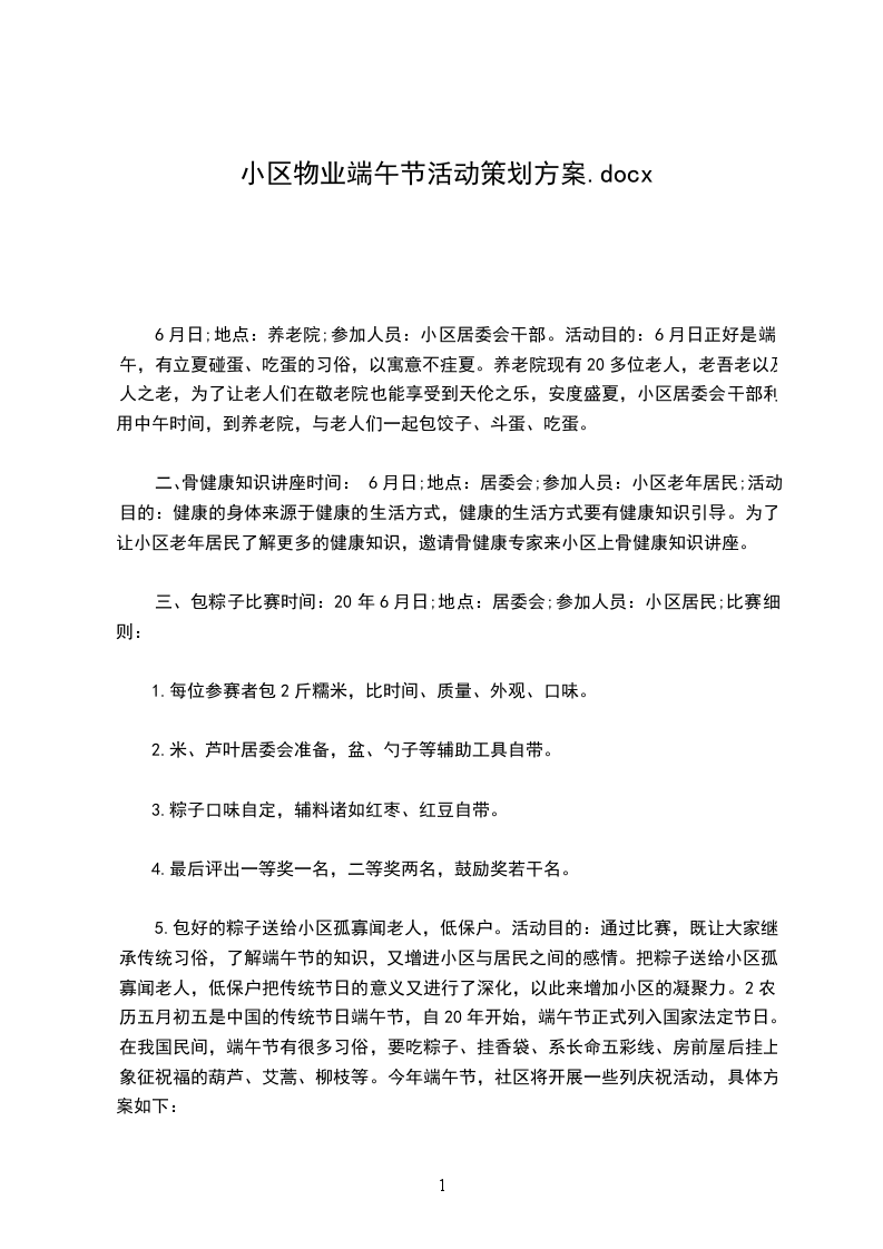 1、运动流程14:3015:30负责人致辞、包粽子;15:3016:00互动环节端午节知识竞答;16:0016:30吃粽子;17:00运动停止收尾工作全体物业人员。注:15:30包完粽子后可拿到食堂煮熟,或自己带回家蒸煮。