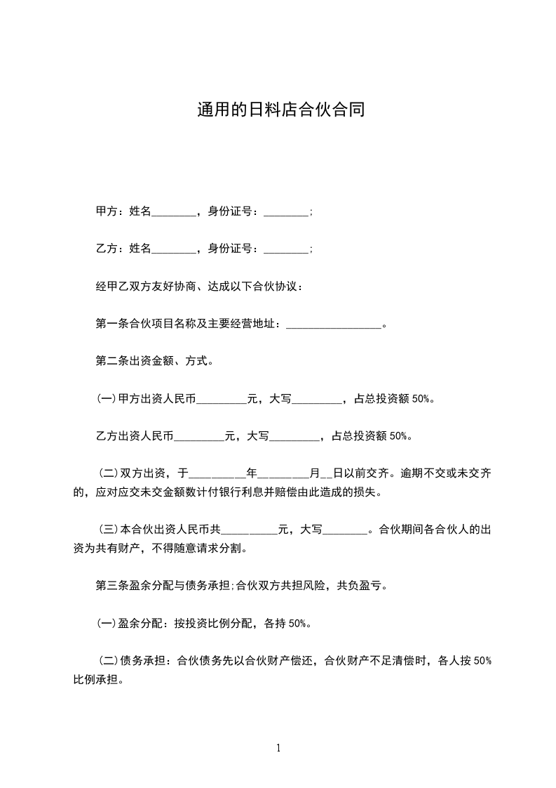 第四条合伙双方共同经营、共同劳动,共担风险,共负盈亏。盈余按照甲百分之五十,乙按照百分之五十比例分配。