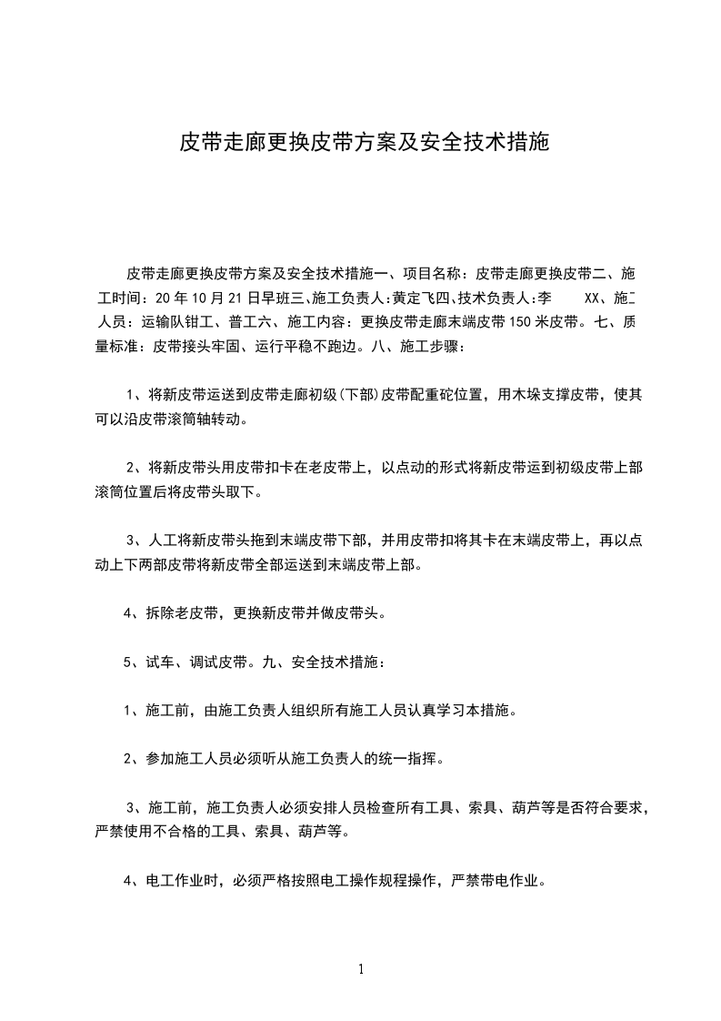 皮带走廊更换皮带方案及安全技术措施一、项目名称:皮带走廊更换皮带二、施工时间:20年10月21日早班三、施工负责人:黄定飞四、技术负责人:李XX、施工人员:运输队钳工、普工六、施工内容:更换皮带走廊末端皮带150米皮带。七、质量标准:皮带接头牢固、运行平稳不跑边。八、施工步骤: