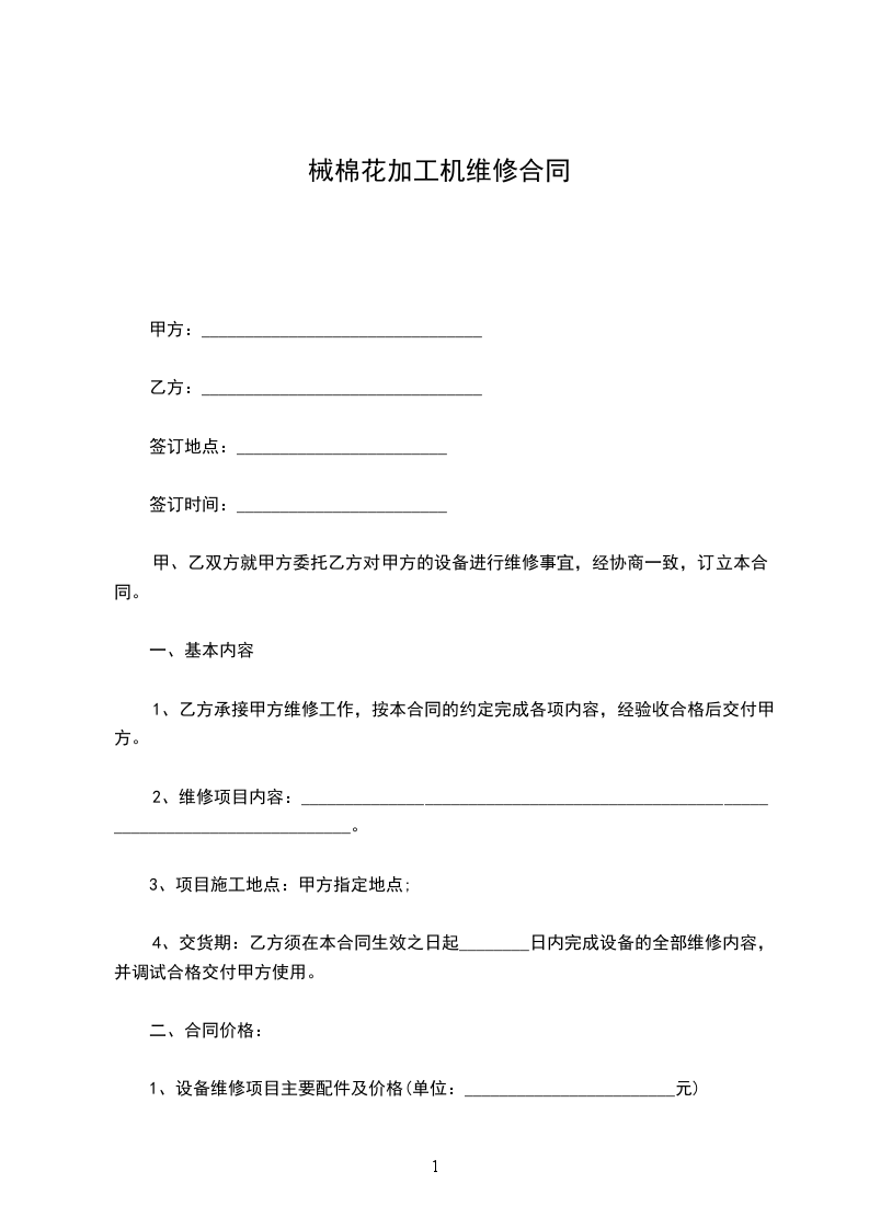 4、交货期:乙方须在本合同生效之日起________日内完成设备的全部维修内容,并调试合格交付甲方使用。
