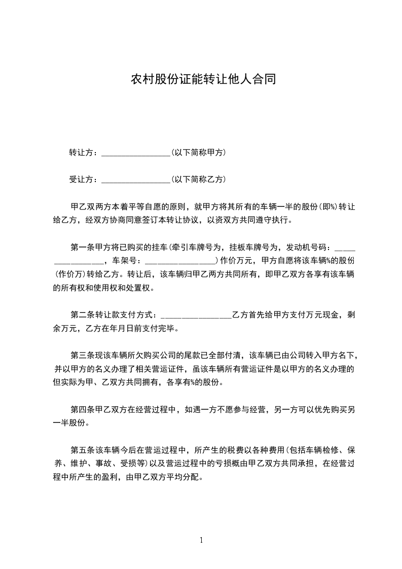甲乙双两方本着平等自愿的原则,就甲方将其所有的车辆一半的股份(即%)转让给乙方,经双方协商同意签订本转让协议,以资双方共同遵守执行。