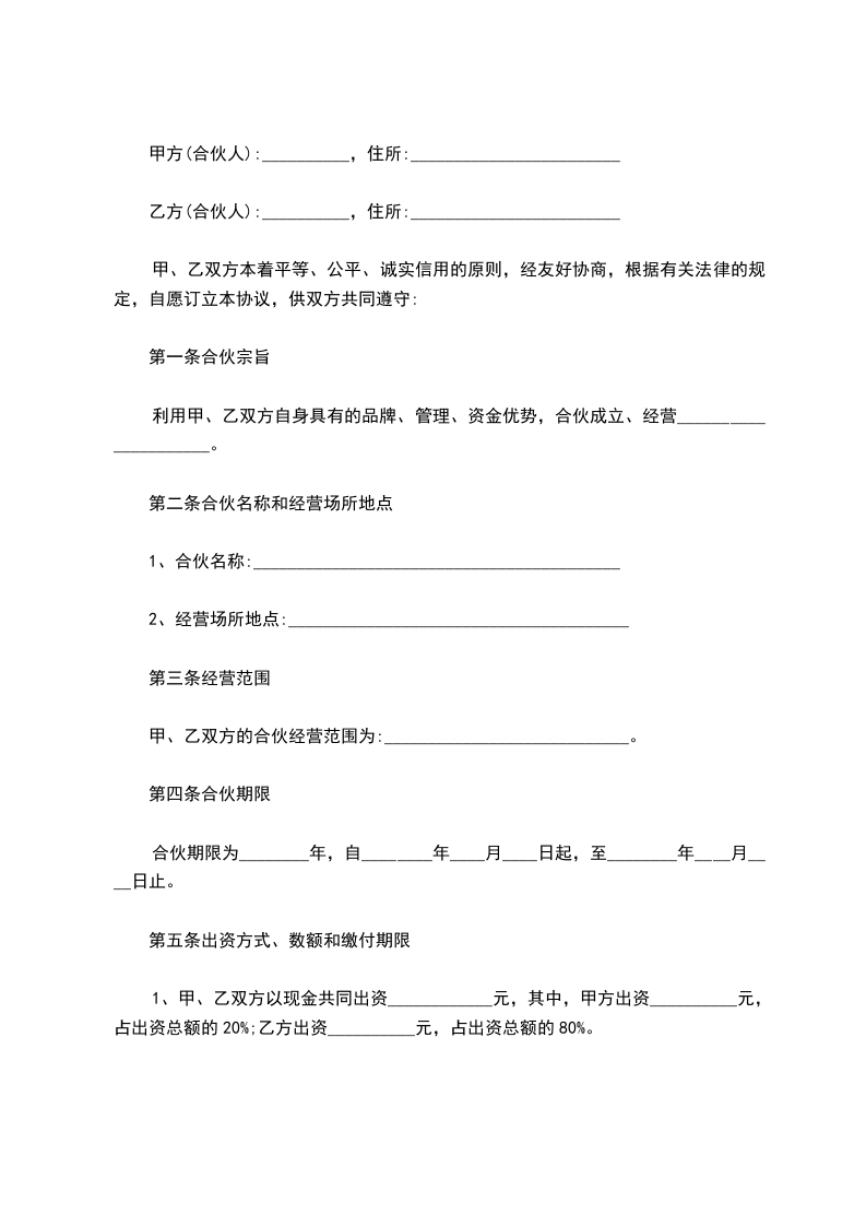 1、甲、乙双方以现金共同出资____________元,其中,甲方出资__________元,占出资总额的20%;乙方出资__________元,占出资总额的80%。