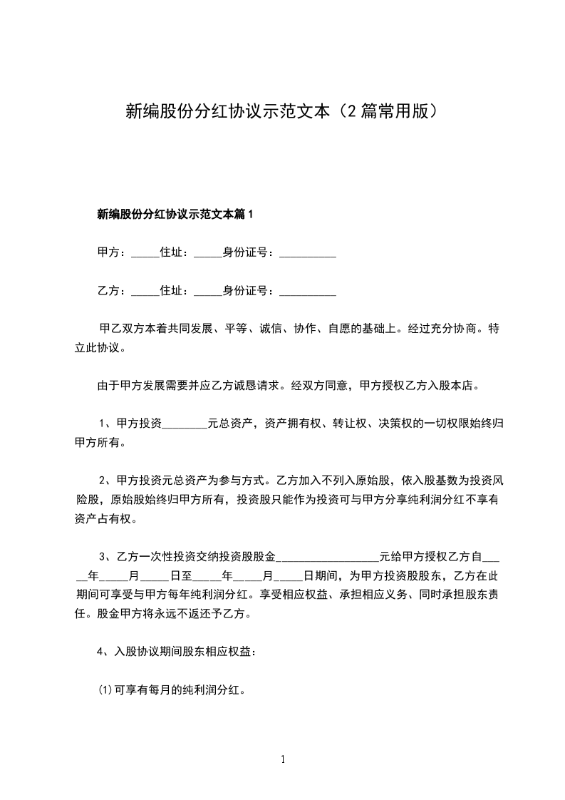 2.1 甲方在协议期限内,每年分配给乙方共____________的干股,即甲方将年终税后净利润的_____________分配给乙方。