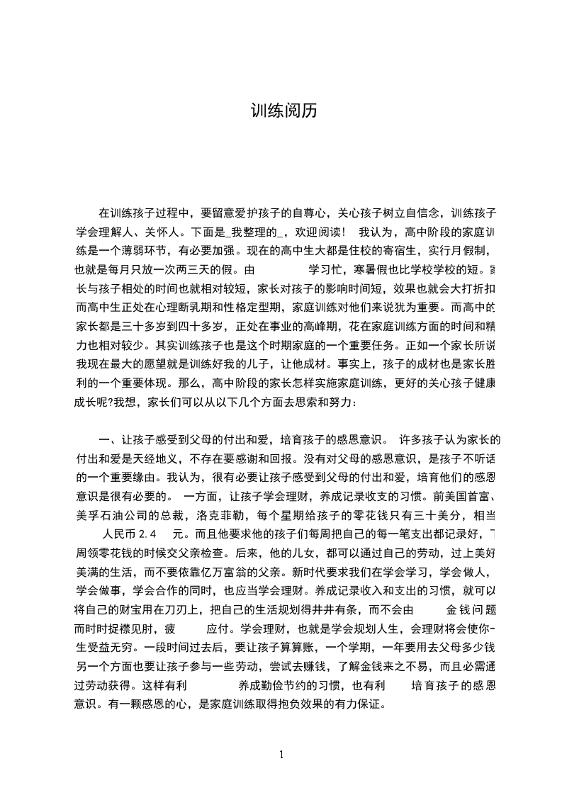 在训练孩子过程中,要留意爱护孩子的自尊心,关心孩子树立自信念,训练孩子学会理解人、关怀人。下面是_我整理的_,欢迎阅读! 我认为,高中阶段的家庭训练是一个薄弱环节,有必要加强。现在的高中生大都是住校的寄宿生,实行月假制,也就是每月只放一次两三天的假。由 学习忙,寒暑假也比学校学校的短。家长与孩子相处的时间也就相对较短,家长对孩子的影响时间短,效果也就会大打折扣。而高中生正处在心理断乳期和性格定型期,家庭训练对他们来说犹为重要。而高中的家长都是三十多岁到四十多岁,正处在事业的高峰期,花在家庭训练方面的时间和精力也相对较少。其实训练孩子也是这个时期家庭的一个重要任务。正如一个家长所说我现在最大的愿望就是训练好我的儿子,让他成材。事实上,孩子的成材也是家长胜利的一个重要体现。那么,高中阶段的家长怎样实施家庭训练,更好的关心孩子健康成长呢?我想,家长们可以从以下几个方面去思索和努力: