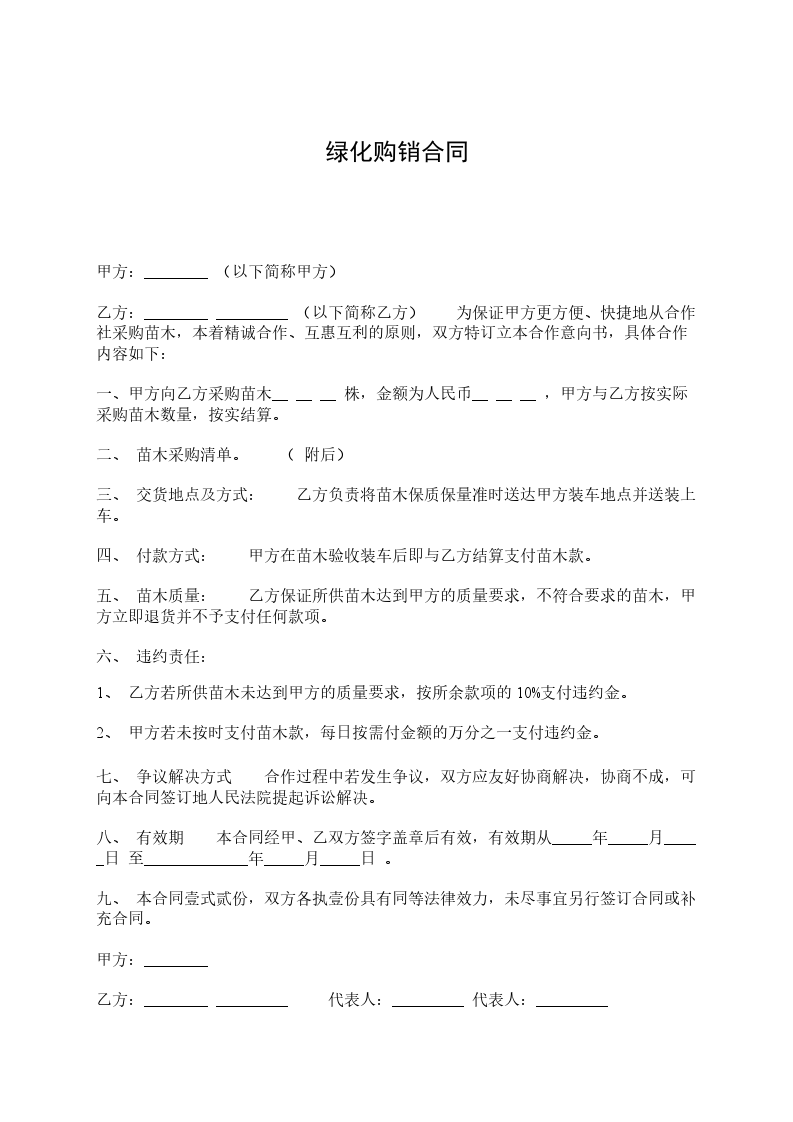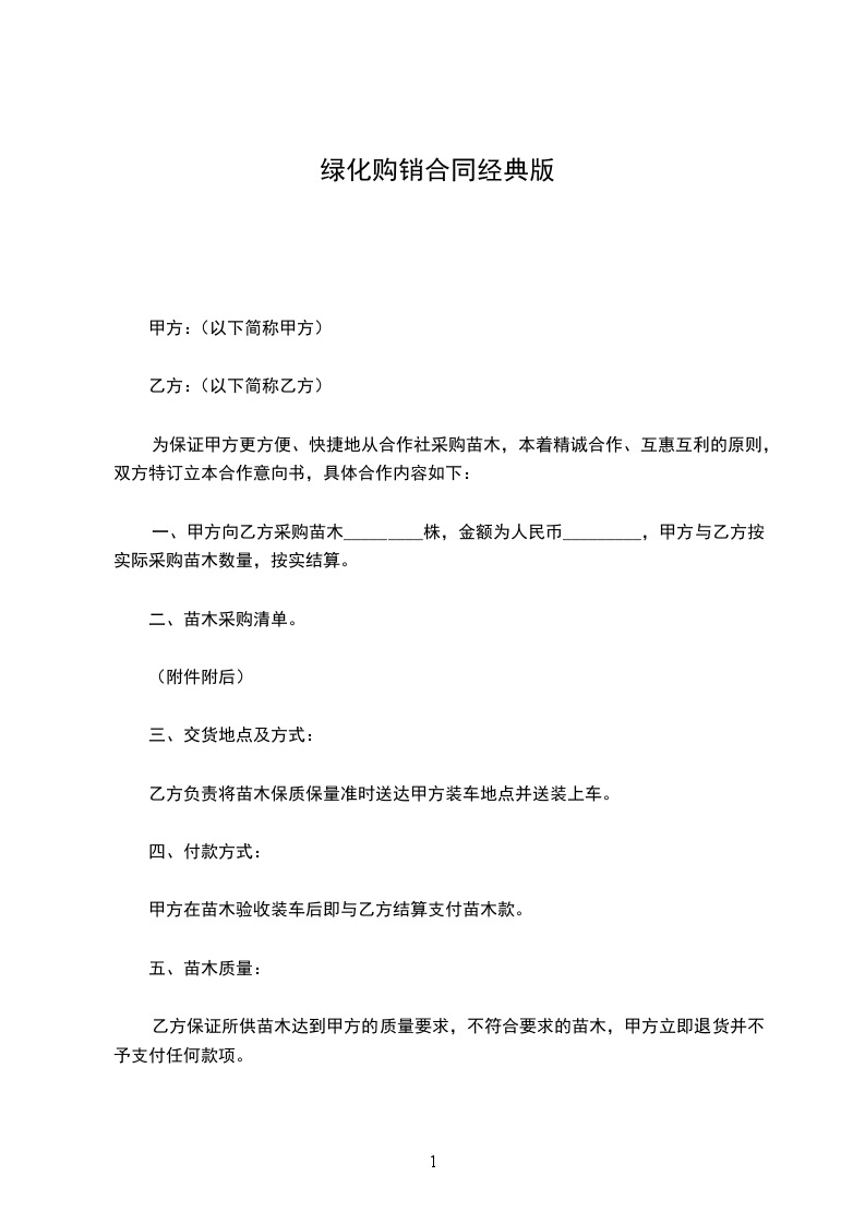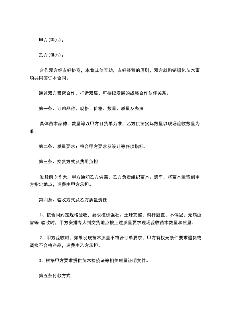 一、甲方向乙方采购苗木_________株,金额为人民币_________,甲方与乙方按实际采购苗木数量,按实结算。