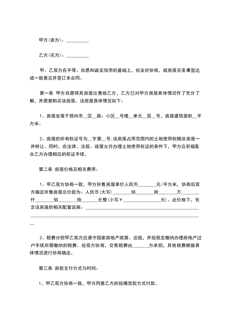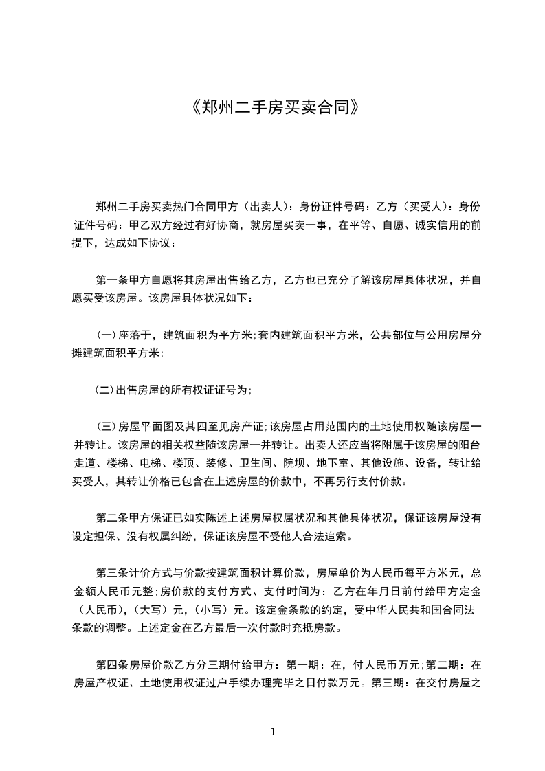 第十二条 本合同一式五份。双方各执两份,房屋权属登记机关一份。 出卖方(甲方):_ 购买方(乙方):_ 身份证号码: _ 身份证号码: _ 身份证号码: _ 地址:_ 地址:_ 电话:_ 20xx年7月15日 20xx 年7月15日 延长阅读: 郑州二手房购房合同留意事项:
