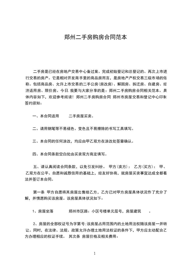 二手房是已经在房地产交易中心备过案、完成初始登记和总登记的、再次上市进行交易的房产。它是相对开发商手里的商品房而言,是房地产产权交易三级市场的俗称。包括商品房、允许上市交易的二手公房(房改房)、解困房、拆迁房、自建房、经济适用房、限价房。今日.我要与大家分享的是:郑州二手房购房合同相关范本。具体内容如下,欢迎参考阅读! 郑州二手房购房合同 郑州市房屋交易和登记中心印制 签约须知: