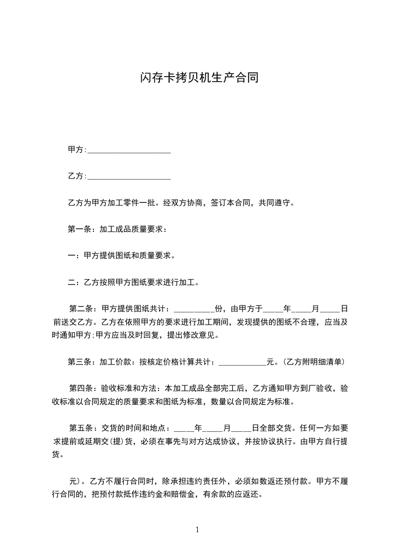 二:乙方逾期交付加工件的,应当向甲方偿付违约金,每逾期一天,按甲方向乙方给付预付款:_____________________元(大写:____________________________。