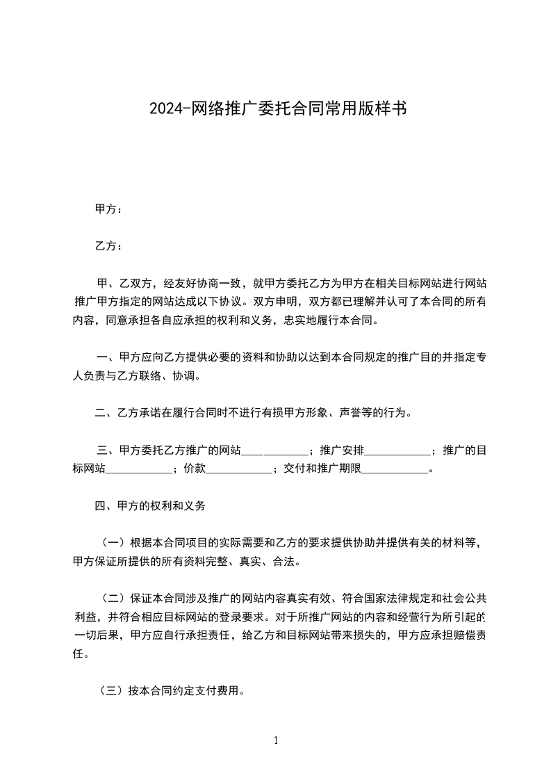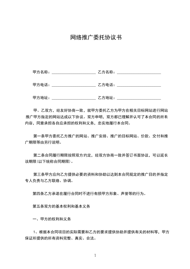 三、甲方委托乙方推广的网站____________;推广安排____________;推广的目标网站____________;价款____________;交付和推广期限____________。