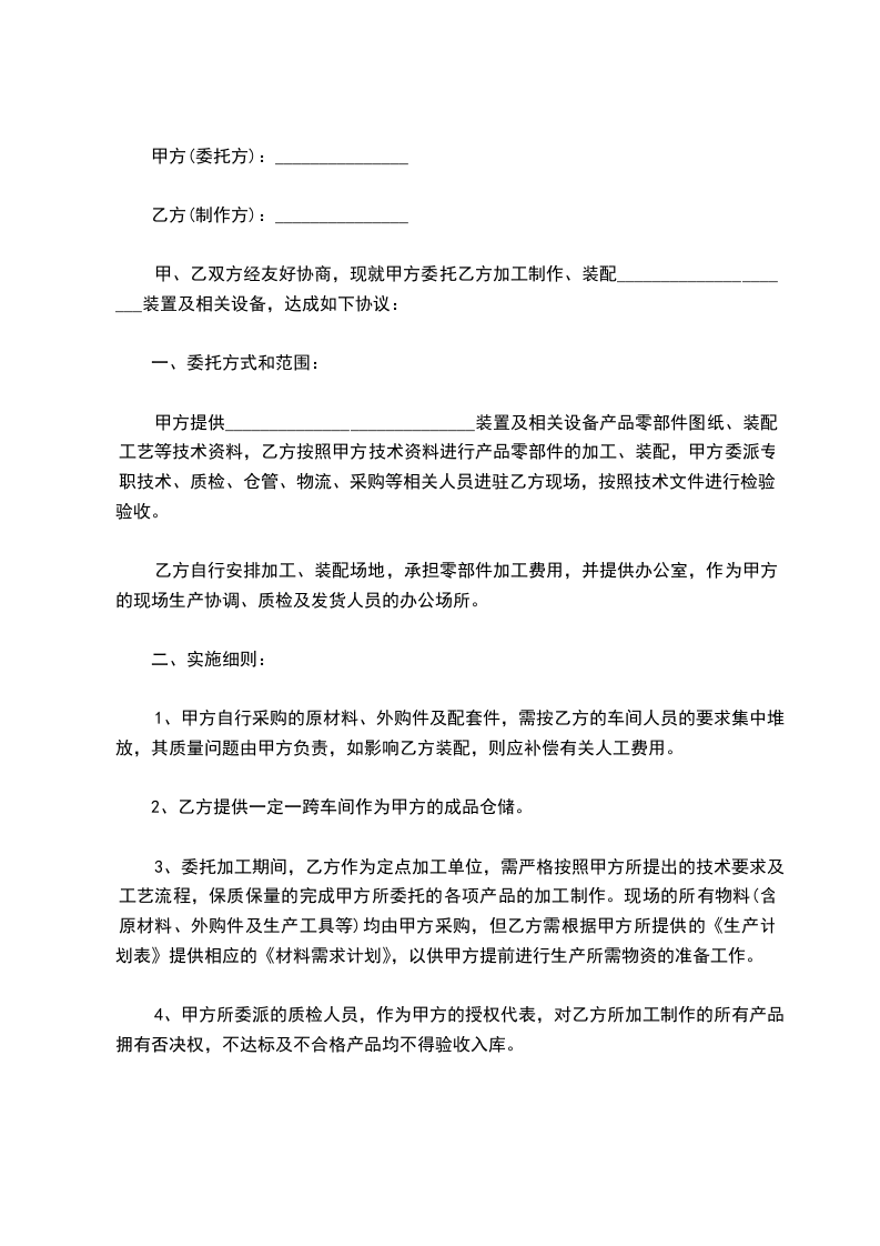 甲、乙双方经友好协商,现就甲方委托乙方加工制作、装配_____________________装置及相关设备,达成如下协议: