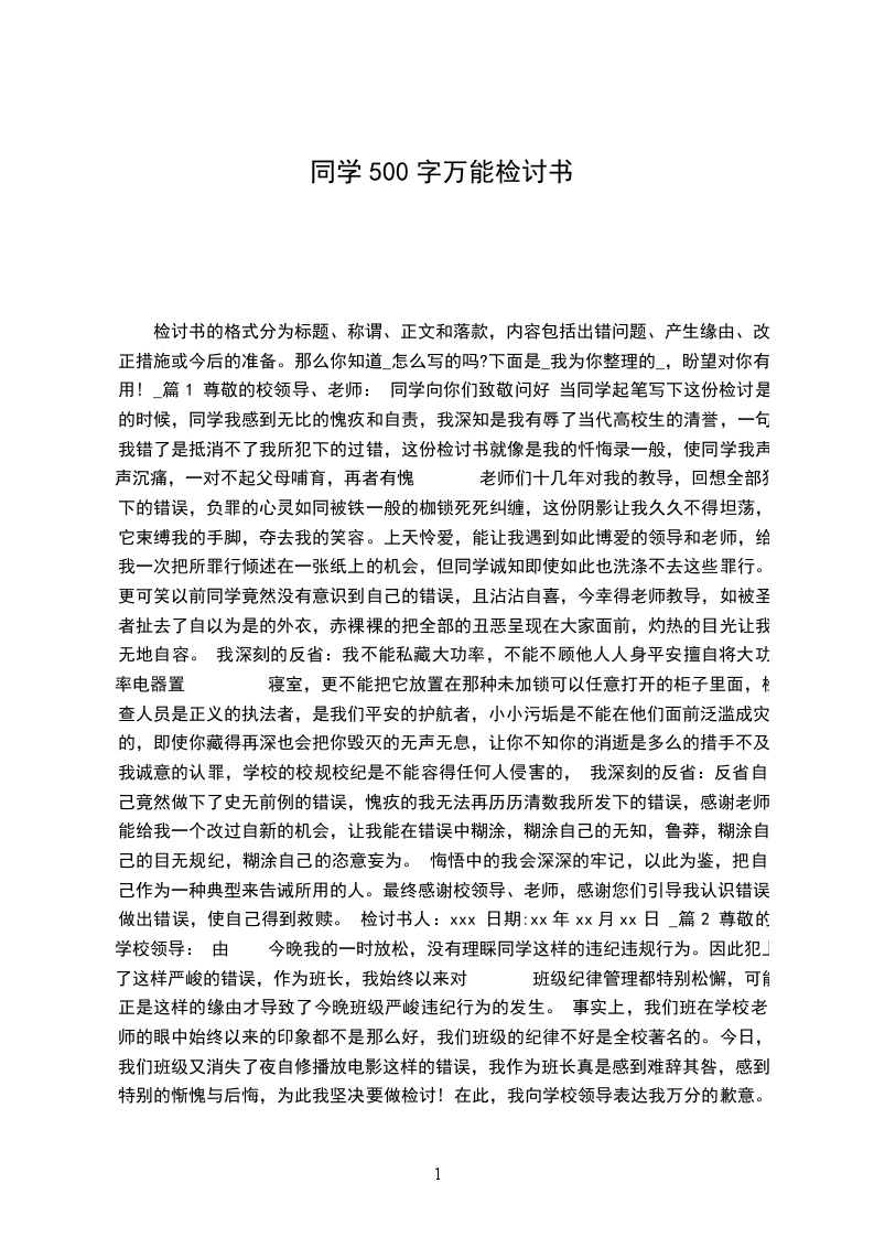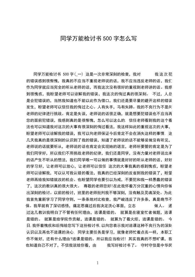 同学万能检讨书 500字(_一) 这是一次非常深刻的检查,我对 我这次犯的错误感到很惭愧,我真的不应当不重视老师说的话,我不应当违反老师的话,我们作为同学就应当完全的听从老师的话,而我这次没有很好的重视到老师讲的话。我感到很愧疚,我盼望老师可以谅解我的错误,我这次的悔过真的很深刻。 不过,人总是会犯错误的,当然我知道也不能以此作为借口,我们还是要尽量的避开这样的错误发生,盼望老师可以信任我的悔过之心。人有失手,马有失蹄。我的不良行为不是向老师的纪律进行挑战。肯定是失误,老师说的话很正确,就是想要犯错误也不应当再您的面前犯错误,我感到真的是很惭愧,怎么可以这么的. 信任老师看到我的这个看法也可以知道我对这次的大事有很深刻的悔过看法,我这样如此的重视这次的大事,盼望老师可以谅解我的错误,我可以向老师保证今后肯定不会在消失这样的事情. 这几天我真的是很深刻的认识到了我的错误,知道了老师说的话不能够装做没有听见,老师说的话就要听从,老师说的话也肯定会实现她的诺言,老师所要管的肯定是为了我们同学好,所以我们不用挑战老师的纪律,我们还是同学,没有力量对老师说出来的话产生不听从的想法,我们同学唯一可以做的事情就是好好的听从老师的话,好好的学习好,让老师可以放心,让老师可以信任 这次的大事我真的感到愧疚,盼望老师可以谅解我,可以认可我认错的看法,我真的已经深刻的反省到我的错误了,盼望老师再给我知错就改的机会。也盼望同学也要引以为戒,不要犯和我一样愚蠢的错误了,这次的教训真的很大很大。 尊敬的老师您好!在此我怀着万分沉重的心情向你做出深刻的检讨。以前的检讨,班里的老师批判我不够深刻,没有触及灵魂深处。为此,我首先重新学习了同学守则,一条条地对比检查,我严峻违反了许多条,真是晚节不保。我早就有了深切感悟,痛定思痛过后我决定洗心革面,立志 做人。 通过这几教训我明白了不管有任何理由,逃课是错的。 就算是在寝室忙者做题,逃课是错的。 就算是给学院作贡献,逃课是错的。 就算为了看火炬,逃课是错的。 今日,我怀着愧疚和后悔给您写下这份检讨书,以向您表示我对逃课这种不良行为的深刻认识以及再也不逃课的决心. 同学主要任务是学习,就像老师忙着点名一样,本职工作不做好,还有什么理由?逃课是错的。所以我应当检讨! 其实我真的不想旷课,我也知道自己不对了,不信我说给你看,由 我写好检讨书了。 守时守信是中华民族的优良传统美德,是当代高校生理应具备的品质,是。我旷课一天课,那可是一天的课,反映出来了不少问题! 这不能成为我旷课的理由。鲁迅先生说过歌德也说我们只有仔细反思,查找错误后面的深刻根源,认清问题的本质,才能给集体和自己一个交待,从而得以进步。 古往今来,多少开明之士 比如春秋时期,有个叫李离的司法官,。李离就这样死了,在他面前,我岂能不惭愧,恨不得替他受了这一剑! 同学万能检讨书 500字(_二) 尊敬的杜老师 首先我为今日上午犯下的错误深刻的悔过,今日早上由 自己的懒散,就缺席了1-2节 的中国经典文学, 在班里面造成了严峻的影响, 经过老师的教导, 我知道了自己错误之所在, 为自己的行为感到了深深地愧疚和担心,早在我刚踏进这个学校的时候, 学校以及学院就已 经三令五申,一再强调,作为一个高校的同学,上课不应当迟到,不应当旷课。然而现在, 我却旷课了。 老师反复教导言犹在耳,严厉?仔细的表情犹在眼前,我深为震撼,也已经深刻认识到此事的重要性, 是我一再告诉自己要把此事当成头等大事来抓, 不能辜负老师对我们的一片 苦心,但是,在实际的生活中,由 个人的惰性,我还是把老师的谆谆教导抛 脑后。今日写下这份检讨书,不仅是由 一个学校纪律处理的程序需要,更准确的来说,是想通过这份 检讨,来让自己_老师们的教导,更让自己时刻敲响警钟! 我不想找任何的理由来为自己开脱,由 错了,就是错了,找理由来躲避,只会使自己 越陷越深。推卸责任简单变成一种习惯,而这种习惯养成了就难以去转变了。旷课,不是一件小事。杜老师找我谈话的时候,我感到很愧对老师,更愧对我的家人。进高校的以后,什 么都觉得很新奇,觉得自己有股冲劲,这个世界上就没有自己干不成的事情, 是在生活学习中,对自己要求不严格,作文任意放纵自己。像墙头的野草,风往哪面就想哪边倒,一段时间 对什么有爱好觉得有意思就去忙乎什么, 干事情总是三分钟的热度, 连最重要的学习都落下了,纪律也散漫了。这种状态始终持续着,我现在都大二了,直到现在我才感觉自己糊涂了 些。现在,本在申请灾区减免学费的我本应当对自己更加严格的时候,我却堕落起来,为此我感到非常的惭愧,由 这样的错误是愚蠢的。到底,想得到这些关心是需要自己努力的, 需要的是一个得才兼备的同学,所以我为此深刻检讨自己。 由 以前也发生过此类状况,受到了老师的批判,所以这些心里非常的难过,觉得辜负了老师对自己的谆谆教导,铺张了老师的精力和时间,我实在是不该,但是这次老师却没有对 我发火,并且耐烦的劝告我,使我深刻地反省自己的错误,我觉得特别愧疚,此次的反省尤为深刻,使我觉得改正错误是件迫不及待的事情,经过几个小时的深思,我决定以以下的行 为向老师表达自己认错的决心