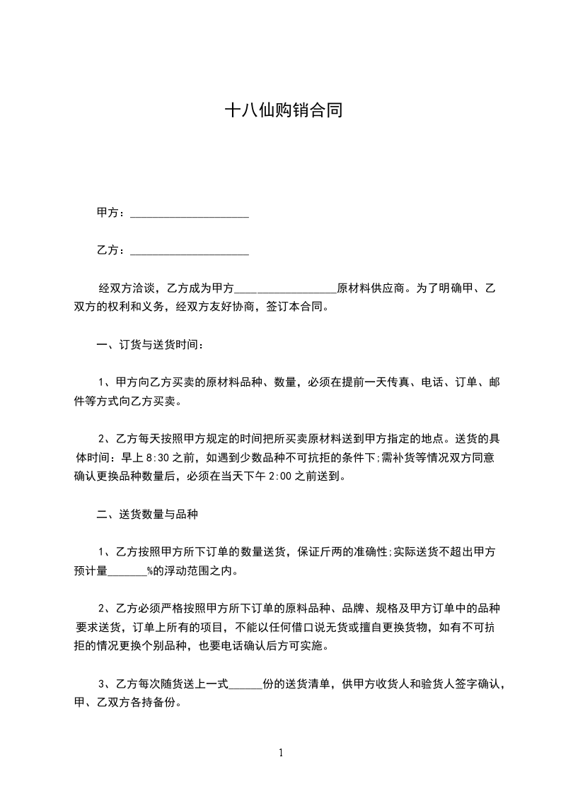 1、视甲方的加工、烹饪需求而定,采购时,甲方提前__________天通知乙方,乙方如不能及时供货,须及时告知甲方。