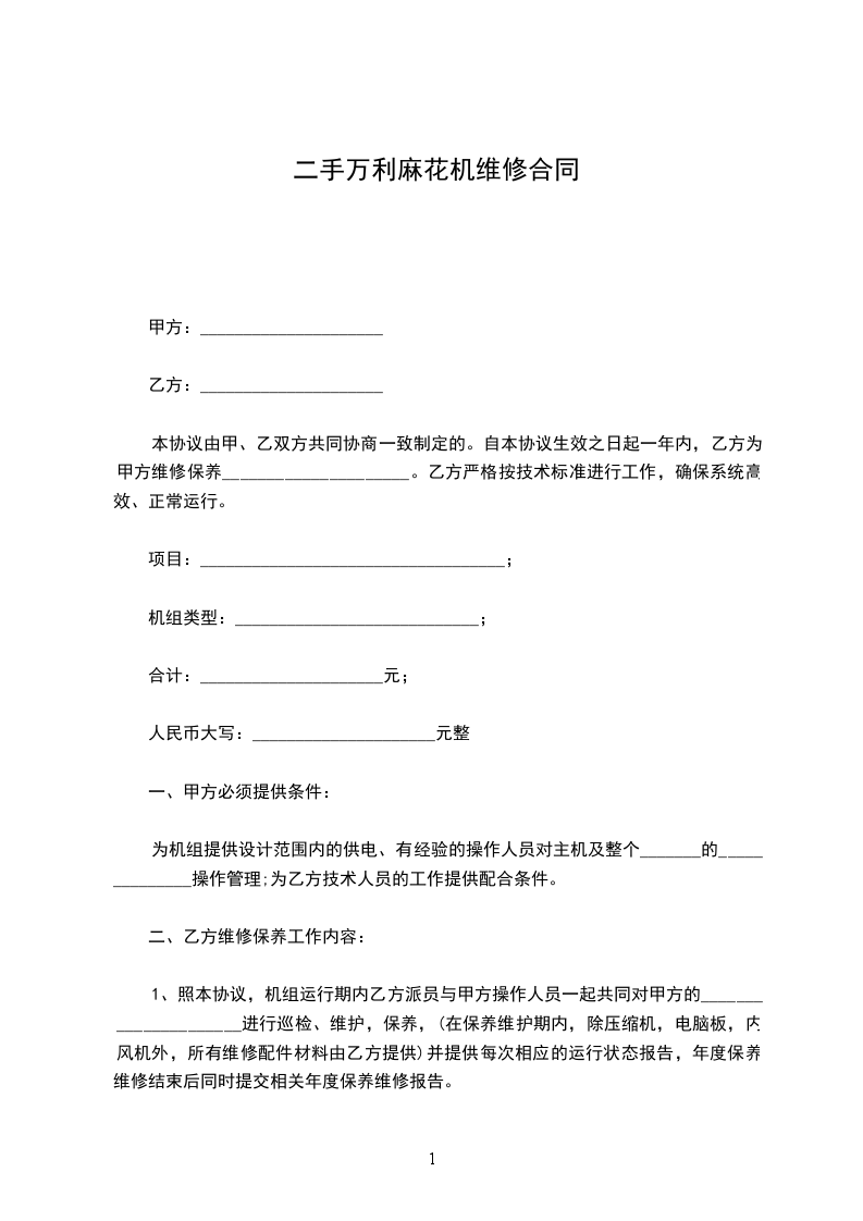 本协议由甲、乙双方共同协商一致制定的。自本协议生效之日起一年内,乙方为甲方维修保养_____________________。乙方严格按技术标准进行工作,确保系统高效、正常运行。