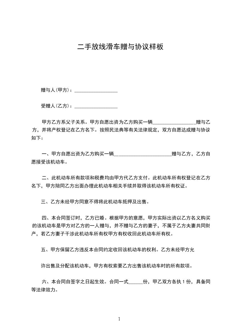 第一条甲方将其所有的______________牌汽车一辆(车牌号:____________________________)无偿赠送给乙方,乙方同意接受赠与。