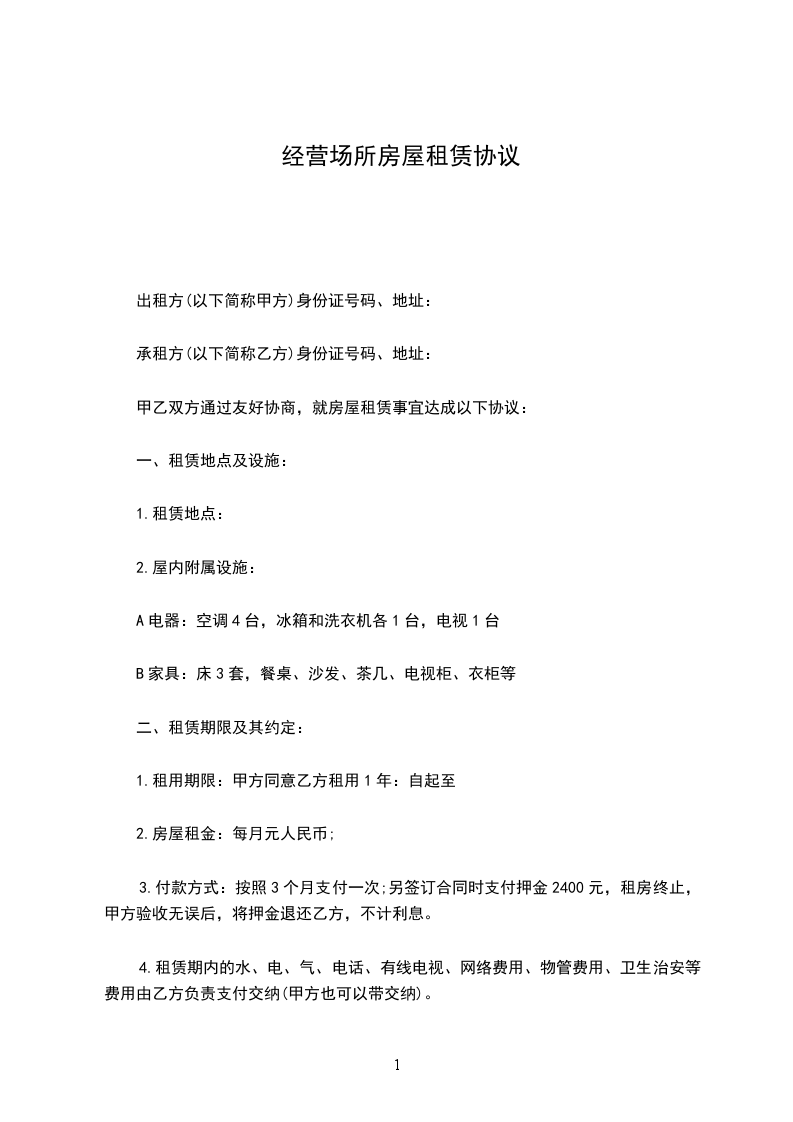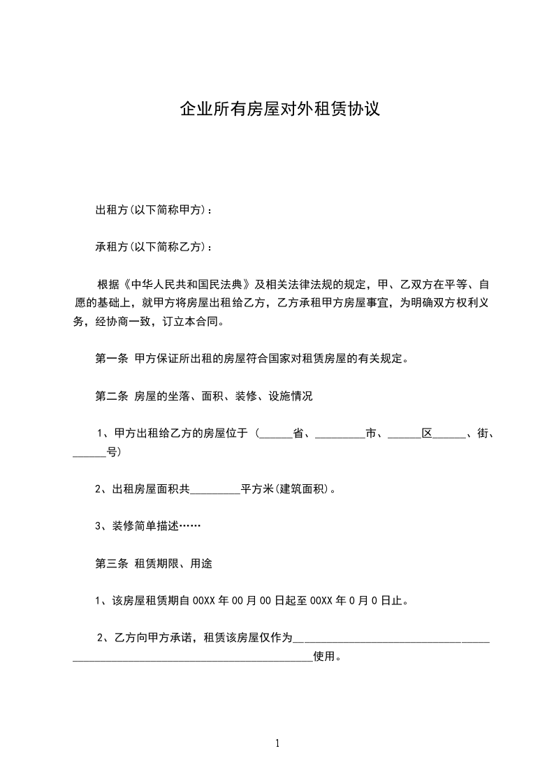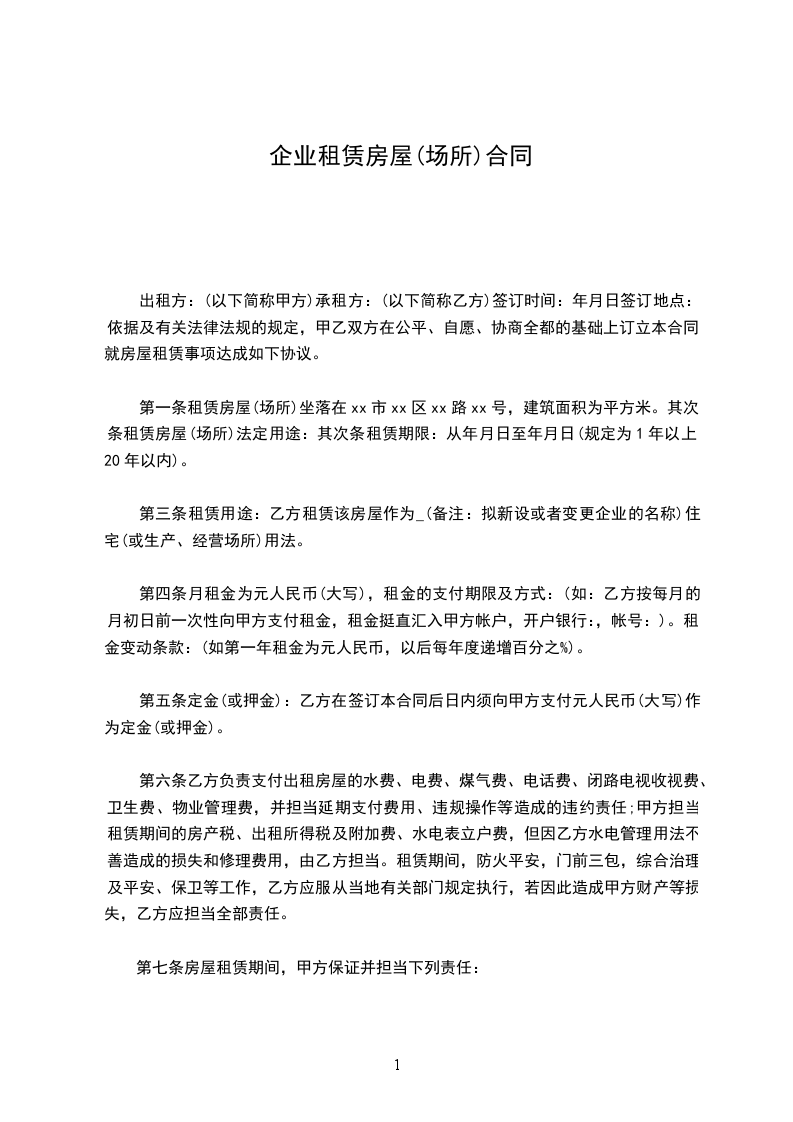 第一条租赁房屋(场所)坐落在xx市xx区xx路xx号,建筑面积为平方米。其次条租赁房屋(场所)法定用途:其次条租赁期限:从年月日至年月日(规定为1年以上20年以内)。