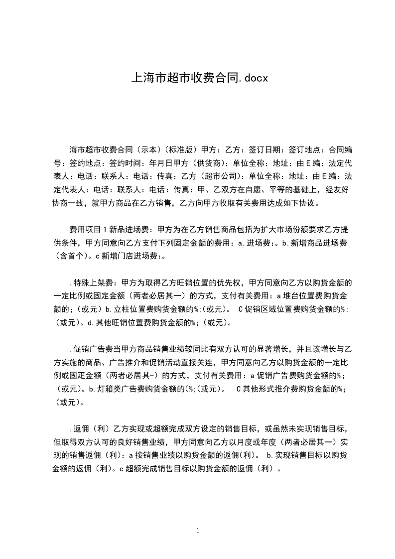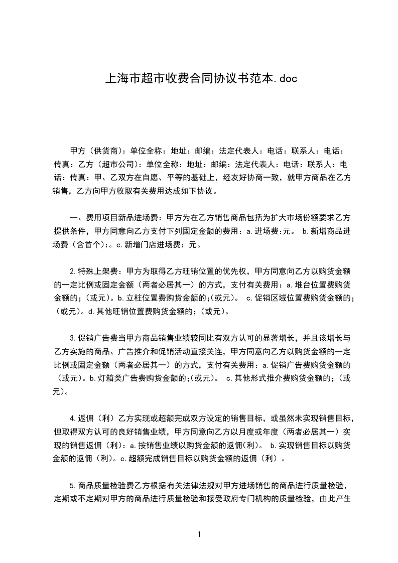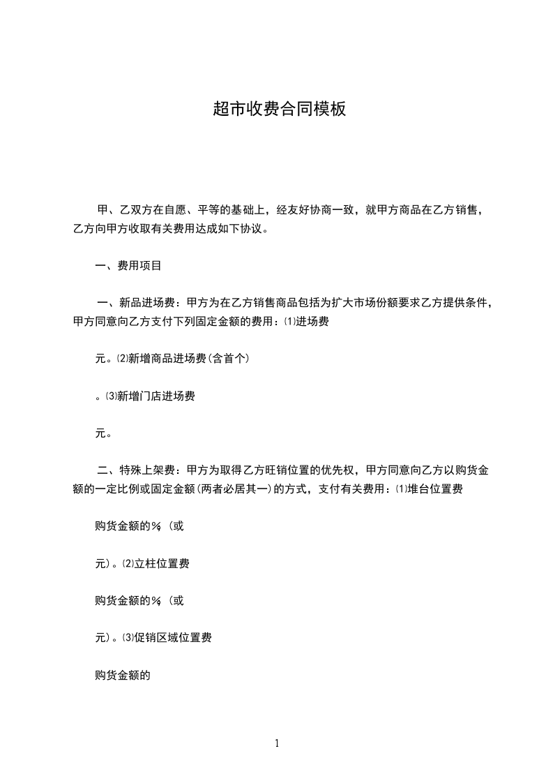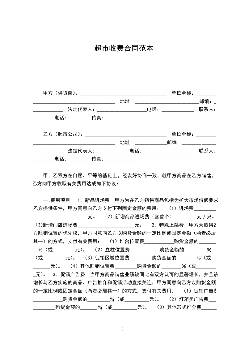 一、费用项目 1.新品进场费 甲方为在乙方销售商品包括为扩大市场份额要求乙方提供条件,甲方同意向乙方支付下列固定金额的费用: (1)进场费_______________________________元。 (2)新增商品进场费(含首个)_________元/只。 (3)新增门店进场费_______________________元。 2.特殊上架费 甲方为取得乙方旺销位置的优先权,甲方同意向乙方以购货金额的一定比例或固定金额(两者必居其一)的方式,支付有关费用: (1)堆台位置费____________购货金额的_________%;(或_________元)。 (2)立柱位置费____________购货金额的_________%;(或_________元)。 (3)促销区域位置费_________购货金额的________%;(或_________元)。 (4)其他旺销位置费_________购货金额的________%;(或_________元)。 3.促销广告费 当甲方商品销售业绩较同比有双方认可的显著增长,并且该增长与乙方实施的商品、广告推介和促销活动直接关连,甲方同意向乙方以购货金额的一定比例或固定金额(两者必居其一)的方式,支付有关费用: (1)促销广告费____________购货金额的_________%;(或__________元)。 (2)灯箱类广告费____________购货金额的_______%;(或__________元)。 (3)其他形式推介费____________购货金额的_____%;(或__________元)。 4.返佣(利) 乙方实现或超额完成双方设定的销售目标,或虽然未实现销售目标,但取得双方认可的良好销售业绩,甲方同意向乙方以月度或年度(两者必居其一)实现的销售返佣(利): (1)按销售业绩___________以购货金额的__________%返佣________(利)。 (2)实现销售目标___________以购货金额的_________%返佣_______(利)。 (3)超额完成销售目标___________以购货金额的______%返佣______(利)。 5.商品质量检验费 乙方根据有关法律法规对甲方进场销售的商品进行质量检验,定期或不定期对甲方的商品进行质量检验和接受政府专门机构的质量检验,由此产生的检验费用和检验的商品补损由甲方承担。 乙方提供政府专门检验机构合法_____凭证,并以凭证金额向甲方结算。