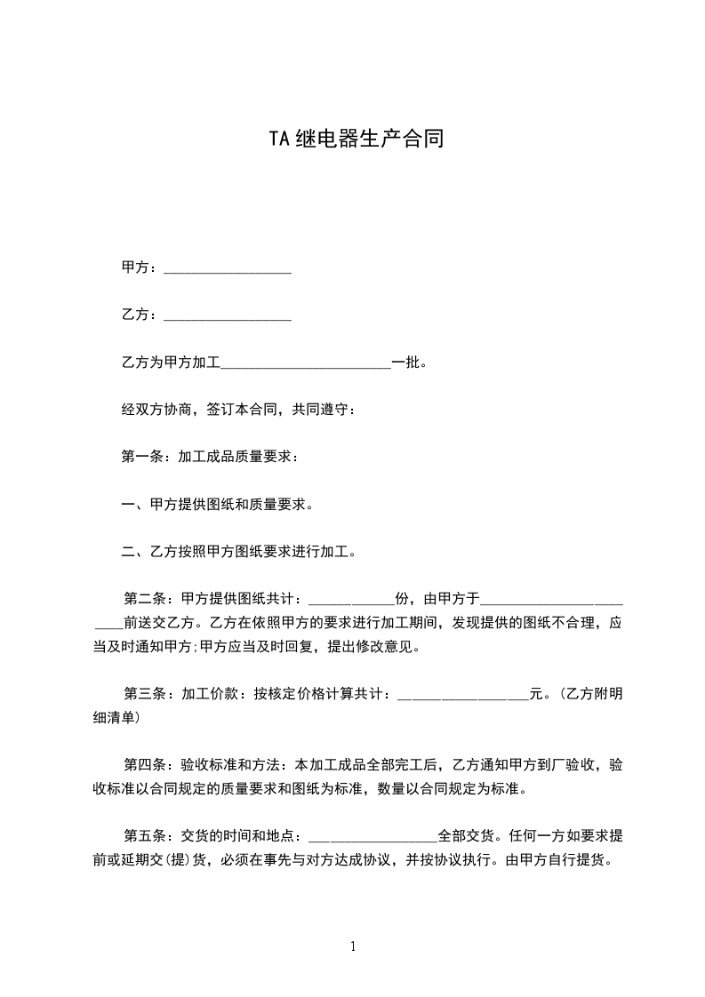二、乙方逾期交付加工件的,应当向甲方偿付违约金,每逾期一天,按逾第六条:本合同签字之日,甲方向乙方给付预付款:____________元(大写:________________________。逾期交付部分的价款总额的百分之一偿付违约金。