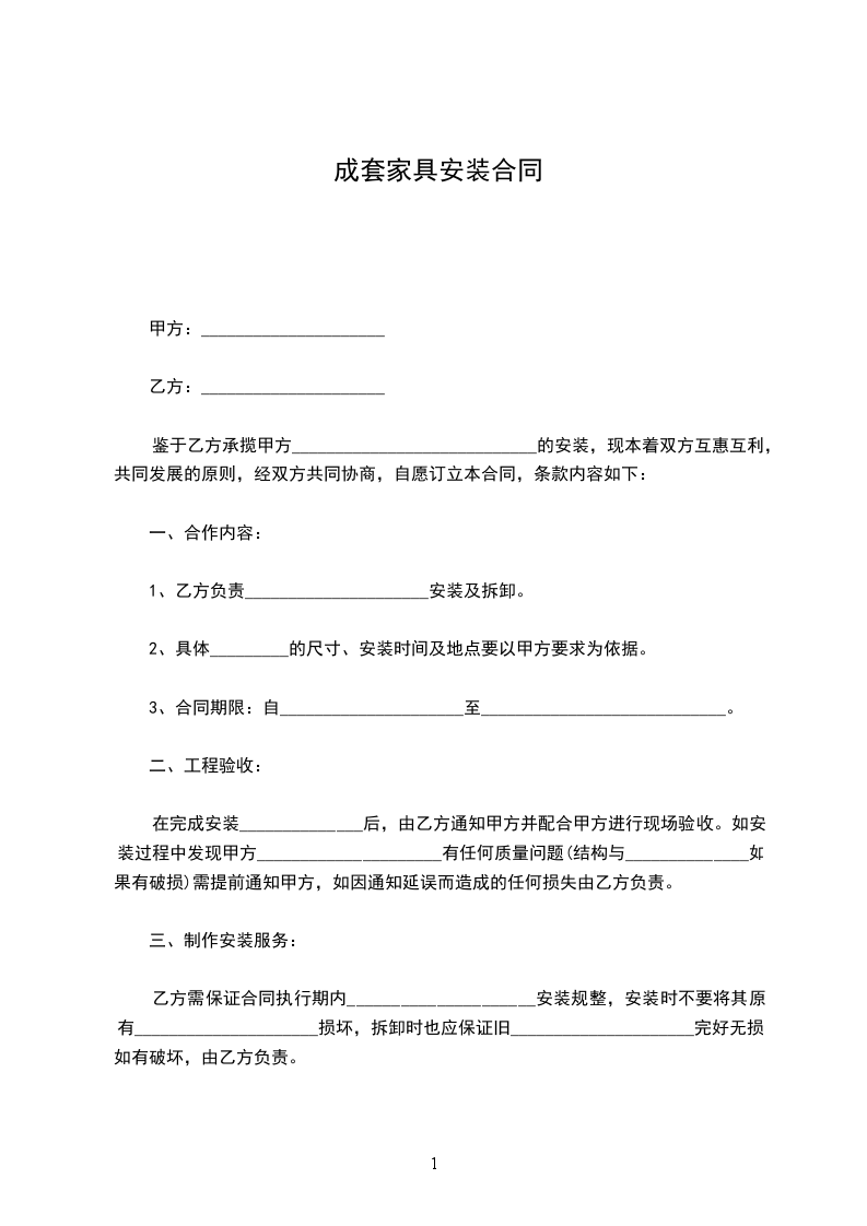 鉴于乙方承揽甲方____________________________的安装,现本着双方互惠互利,共同发展的原则,经双方共同协商,自愿订立本合同,条款内容如下: