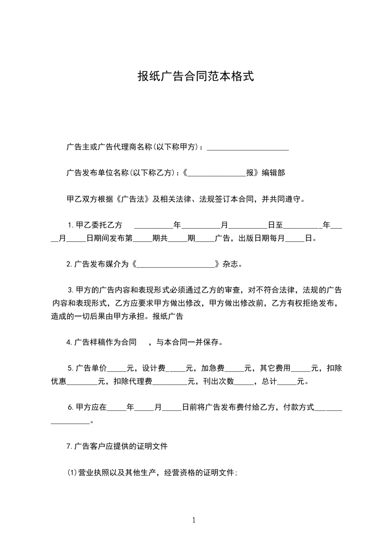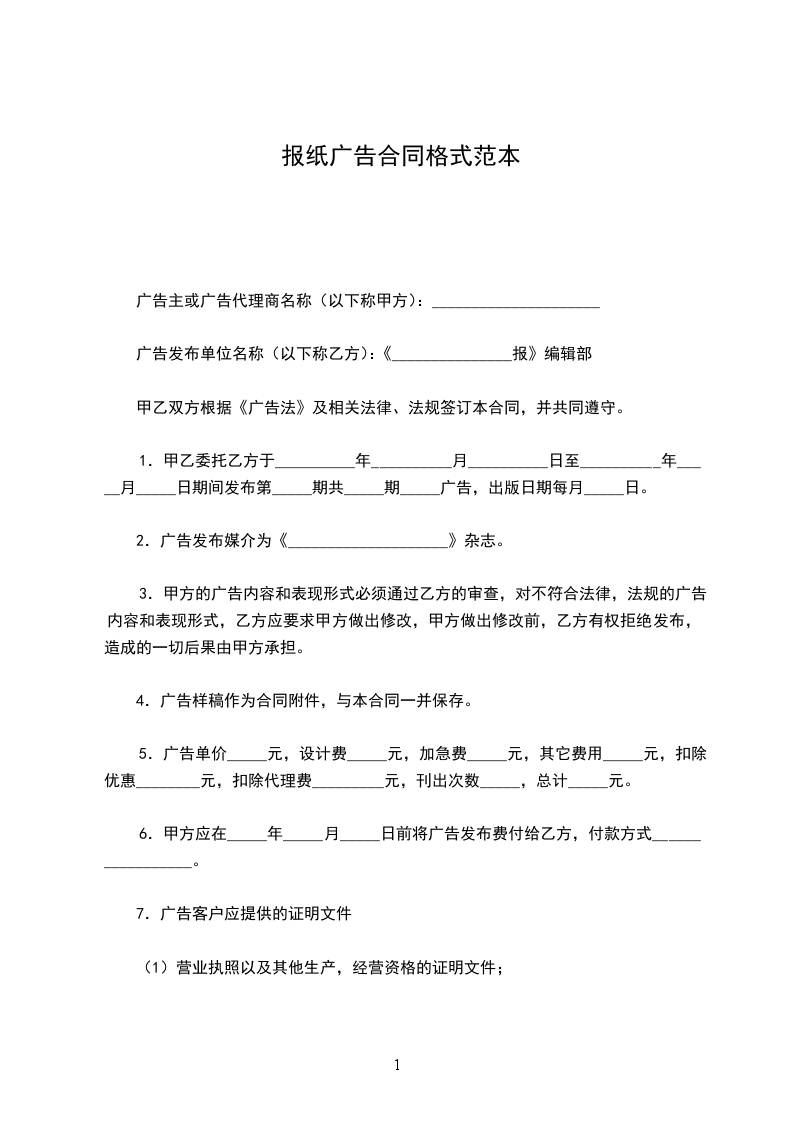 1.甲乙委托乙方于__________年__________月__________日至__________年_____月_____日期间发布第_____期共_____期_____广告,出版日期每月_____日。