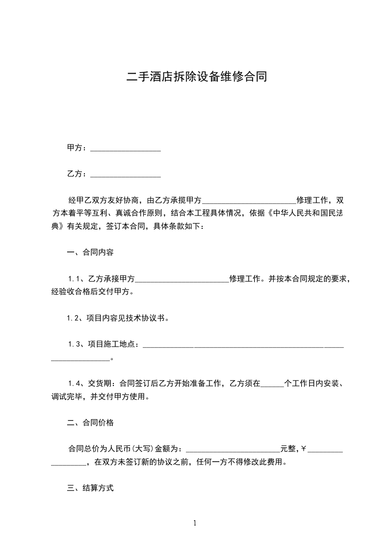 1.1、乙方承接甲方________________________修理工作。并按本合同规定的要求,经验收合格后交付甲方。