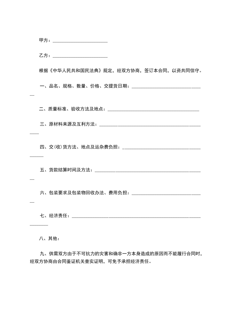 十七、不可抗力:由于不可抗力的原因而造成不能完成合同义务,买卖双方按________________________协议规定办理。
