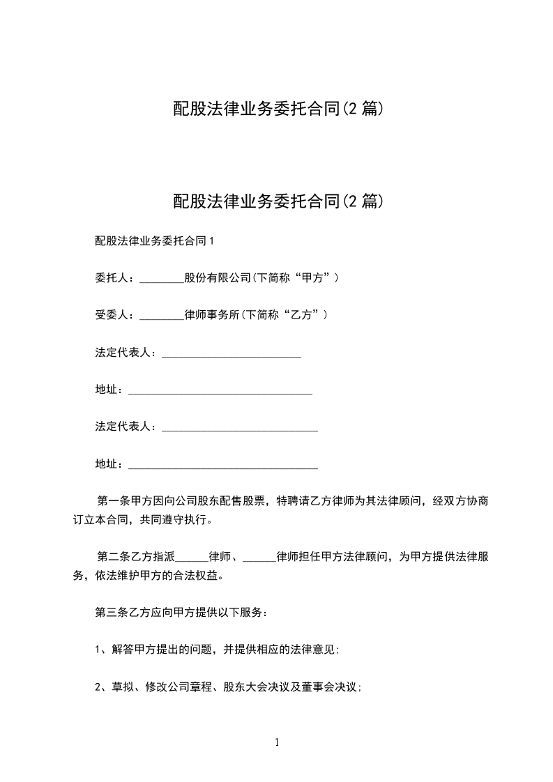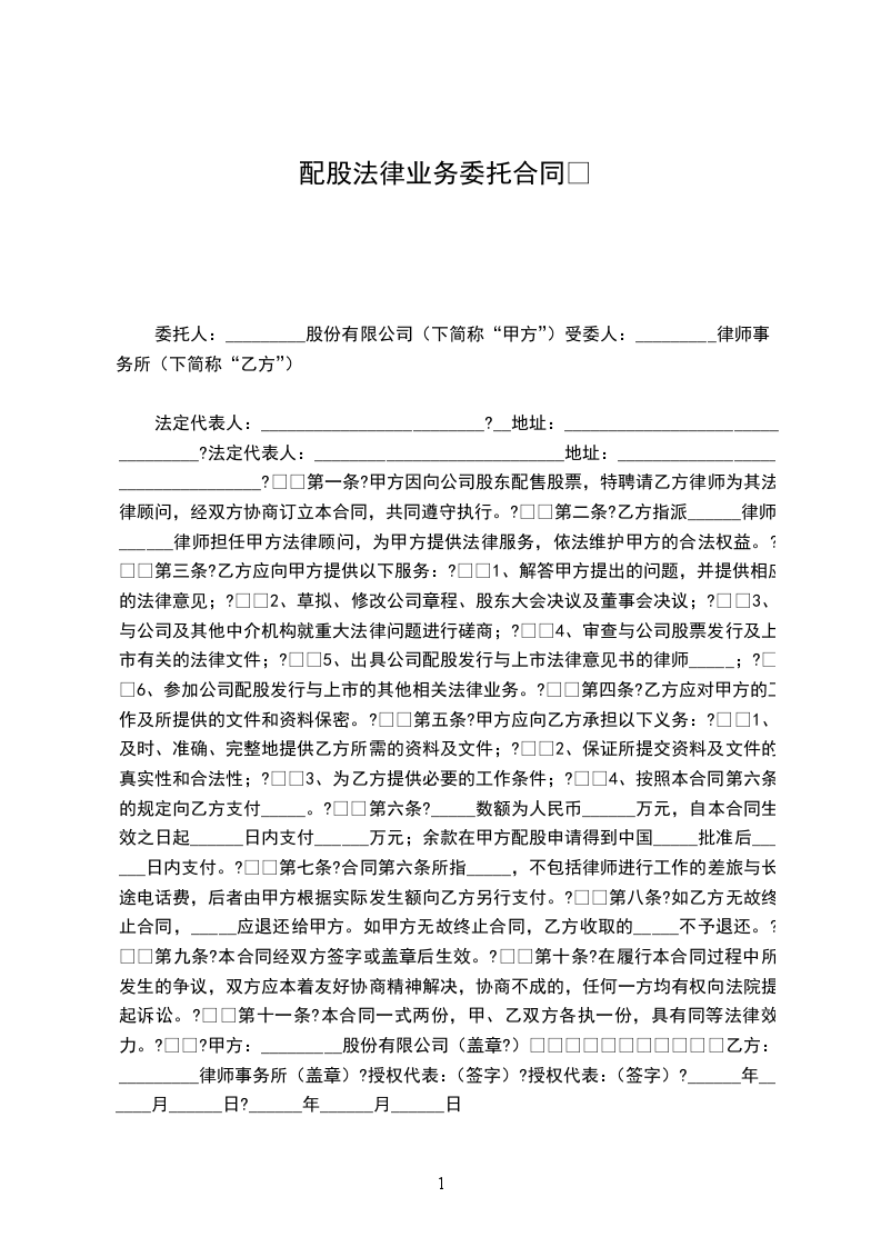 法定代表人:_________________________?__地址:_________________________________?法定代表人:____________________________地址:__________________________________?第一条?甲方因向公司股东配售股票,特聘请乙方律师为其法律顾问,经双方协商订立本合同,共同遵守执行。?第二条?乙方指派______律师、______律师担任甲方法律顾问,为甲方提供法律服务,依法维护甲方的合法权益。?第三条?乙方应向甲方提供以下服务:?1、解答甲方提出的问题,并提供相应的法律意见;?2、草拟、修改公司章程、股东大会决议及董事会决议;?3、与公司及其他中介机构就重大法律问题进行磋商;?4、审查与公司股票发行及上市有关的法律文件;?5、出具公司配股发行与上市法律意见书的律师_____;?6、参加公司配股发行与上市的其他相关法律业务。?第四条?乙方应对甲方的工作及所提供的文件和资料保密。?第五条?甲方应向乙方承担以下义务:?1、及时、准确、完整地提供乙方所需的资料及文件;?2、保证所提交资料及文件的真实性和合法性;?3、为乙方提供必要的工作条件;?4、按照本合同第六条的规定向乙方支付_____。?第六条?_____数额为人民币______万元,自本合同生效之日起______日内支付______万元;余款在甲方配股申请得到中国_____批准后______日内支付。?第七条?合同第六条所指_____,不包括律师进行工作的差旅与长途电话费,后者由甲方根据实际发生额向乙方另行支付。?第八条?如乙方无故终止合同,_____应退还给甲方。如甲方无故终止合同,乙方收取的_____不予退还。?第九条?本合同经双方签字或盖章后生效。?第十条?在履行本合同过程中所发生的争议,双方应本着友好协商精神解决,协商不成的,任何一方均有权向法院提起诉讼。?第十一条?本合同一式两份,甲、乙双方各执一份,具有同等法律效力。??甲方:_________股份有限公司(盖章?)乙方:_________律师事务所(盖章)?授权代表:(签字)?授权代表:(签字)?______年______月______日?______年______月______日