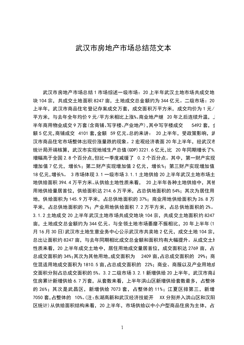 武汉市房地产市场总结1市场综述一级市场:20上半年武汉土地市场共成交地块104宗,共成交土地面积8247亩,土地成交总金额约为344亿元。二级市场:20上半年,武汉市商品住宅登记存案成交万套,成交面积万平方米,成交均价为1元/平方米,与去年全年均价9元/平方米相比上涨%。商业地产继20年之后连续升温,上半年商用物业成交9万套(含商铺、写字楼、产业地产),其中写字楼成交5492套,金额5亿元,商铺成交4101套,金额59亿元。总的来讲:20上半年,受政策影响,武汉市商品住宅市场整体出现价涨量跌的现象。2宏观经济表面20年上半年,经武汉市统计局开端核算,武汉市实现地域生产总值(GDP)3221.6亿元,比20年同期增长了%,增幅高于全国2.8个百分点,但比一季度减缓了0.2个百分点。其中,第一财产实现增加值7亿元,增长%;第二财产实现增加值2亿元,增长%;第三财产实现增加值18亿元,增长%。3市场体现3.1一级市场3.1.1土地供给20上半年武汉土地市场土地供给面积394.4万平方米。从供给土地性质来看,20上半年各种土地供给中,其他用地供给量居首位,供给面积达214.6万平米,占总供地面积的54%;其次为居住用地,供给面积为145.9万平米,占总供地面积的37%;商业用地供给面积为26.8万平米,占总供地面积的7%;产业用地供给面积7.2万平方米,占总供地面积的2%。3.1.2土地成交20上半年武汉土地市场共成交地块104宗,共成交土地面积约8247亩,土地成交总金额约为344亿元。与全领土地市场萎靡不振相比,20年上半年(1月16月30日)武汉市土地生意业务中心公示武汉市共卖地2亿元,成交土地104宗,总出让面积约8247亩,与去年同期相比成交总金额和面积均有大幅提升。从成交土地性质来看,20上半年成交土地中,居住用地成交量居首位,成交面积达2769亩,占总成交面积的34%;其次为其他用地,成交面积为2409亩,占总成交面积的29%;商住混适用地成交面积为1810.5亩,占总成交面积的22%;商业、商服以及产业用地成交面积分别占总成交面积的5%。3.2二级市场3.2.1新增供给20上半年,武汉市商品住房累计新增供给6.7万套,从套数来看,上半年洪山区新增供给套数最多,占整体的26%;其次是武昌区,新增供给7073套,占整体的11%;江夏区排第三,新增7050套,占整体的10%。(注:东湖高新和武汉经济技能开XX分别并入洪山区和汉阳区统计)从供给面积结构来看,20上半年,市场供给以中小户型商品住房为主体,占整体供给量的72%,其中90平方米以下占比最大,供给量为26547套,占比为39%;大于140平方米占比最小,供给量为6511套,仅占总供给量的10%。3.2.2成交量20上半年,武汉市商品住宅登记存案成交万套,成交面积万平方米,与20年同期相比淘汰了5966套。(注:统计范畴包罗甸区、新洲区、汉南区)从整个上半年的销售套数来看,洪山区销售量居首位,销售套数为11184套,占总销售量的22%;其次是江夏区,销售套数为6293套,占总销售量的13%;黄陂区居第三位,销售套数为6186套,占总销售量的12%。3.2.3成交均价20上半年,武汉市商品住宅成交均价为1元/平方米,与去年全年均价9元/平方米相比上涨%。(注:统计范畴包罗甸区、新洲区、汉南区)今年房价统计区域新增蔡甸、汉南、新洲三个远城区,拉低了统计均值,低落了房价上涨幅度。总体来看,全市房价根本停涨,处于盘整状态,部门企业通过赠送面积、精装修等方法实现了暗降,有力促进了销售。成交面积结构中小户型商品住房为市场销售主体。20上半年我市120米以下商品住房为市场的主要需求,销售套数占总量的77%,较去年增加了约2个百分点。其中90平方米以下占比最大,占比为42%,较去年增加了约1.4个百分点;90-120米商品住房销售套数占总套数的35%,较去年增加了0.7个百分点。140平方米以上占比为8%,较去年下降了2.5个百分点。成交代价结构7000元/平方米以下商品住房销量占比约七成。从各代价段销售情况看,20上半年全市商品住房销售中,7000元/平方米以下商品住房销量套数占总销量的67%。其中,4000元/平方米以下销售套数占总销量的30%;4000-5700元/平方米销售套数占总销量的22%;5700-7000元/平方米销售套数占总销量的15%。7000-10000元/平方米销售套数占总销量的24%;10000元/平方米以上销售套数占总销量的9%。别墅产物阐发: