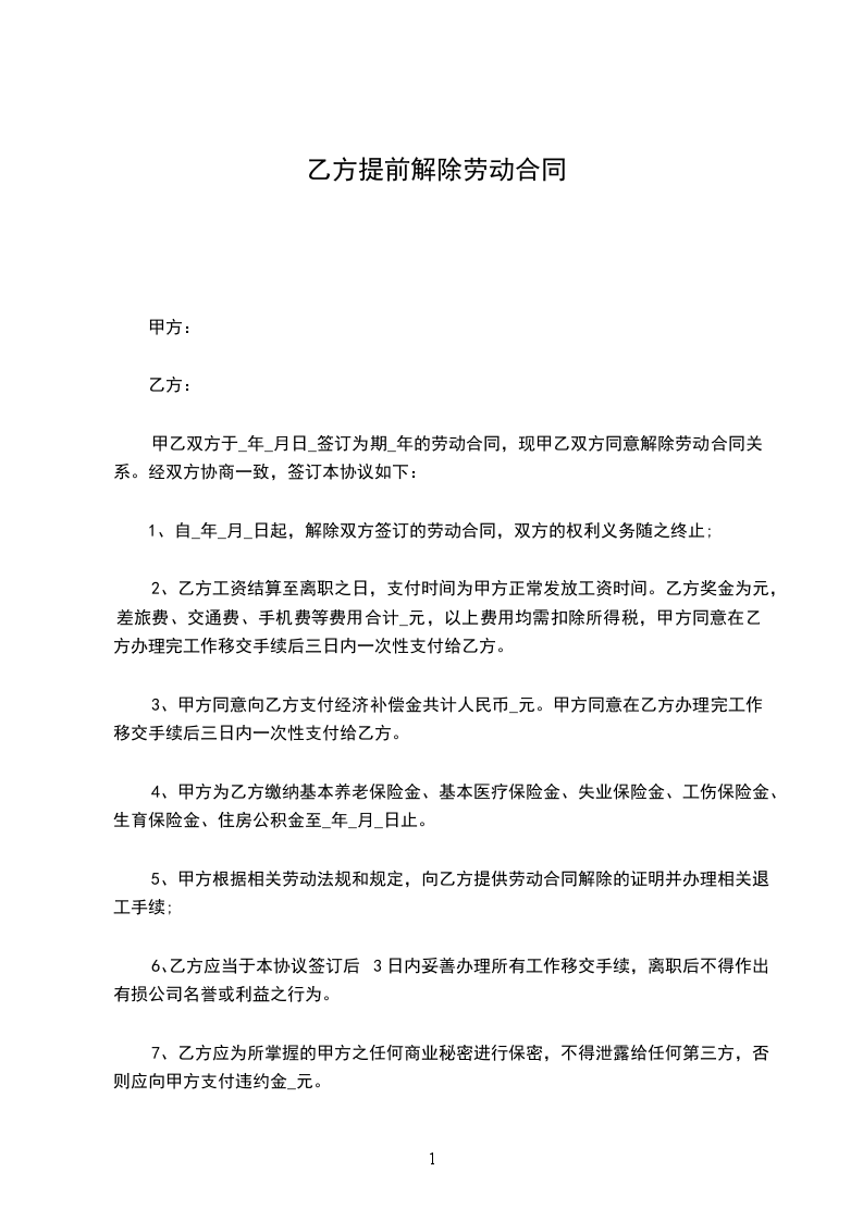 3、提前解除劳动合同文本甲方为乙方缴纳四金(包括基本养老保险金、基本医疗保险金、失业保险金、住房公积金)至__________年__________月__________日止。