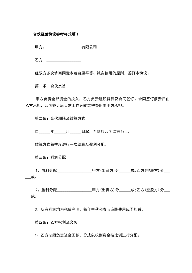 根据《中华人民共和国民法典》及其他有关法律、法规之规定,甲乙双方在平等、自愿、协商一致的基础上,就___________________________________合伙经营有关事宜达成如下协议: