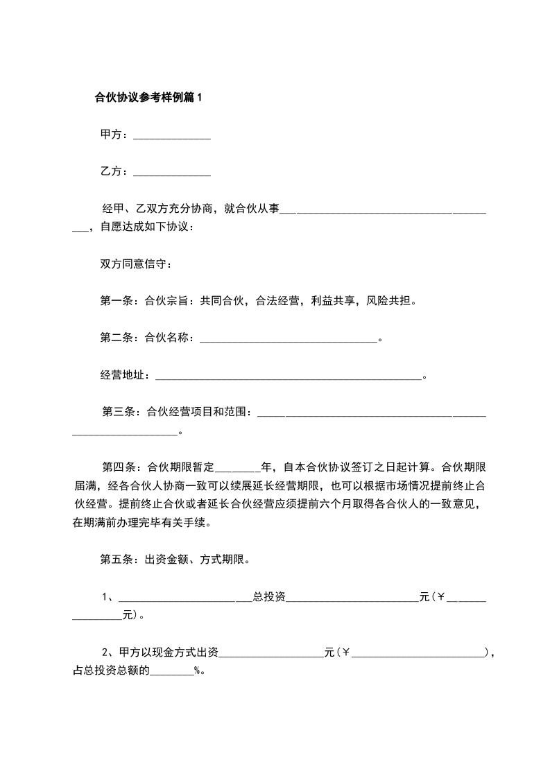 合伙协议参考样例篇1